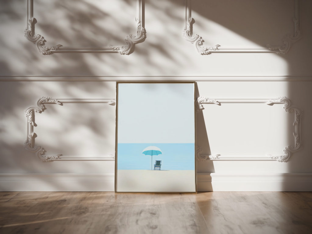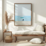 This print captures a tranquil coastal atmosphere, depicting a single beach chair under a protective umbrella with the vastness of the ocean extending into the horizon. The pastel colors convey a sense of calm, inviting the viewer to imagine a soft breeze and the distant sound of waves. The minimalist composition allows for a meditative space within any room, making it an ideal accent for a contemporary setting seeking a touch of serenity. This print is perfect for those who love the sea, appreciate calm sceneries, or simply wish to add a soothing element to their living space or office.