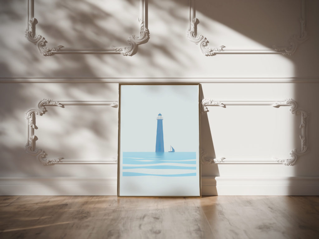 This high-quality print captures the tranquil essence of a coastal scene featuring a towering lighthouse and a solitary sailboat gliding on calm waters. The minimalist design employs a cool color palette, evoking a sense of peace and steadiness. Ideal for those who admire nautical elegance, this artwork seamlessly blends simplicity with a maritime theme, making it a perfect addition to any contemporary space seeking a touch of serenity.
