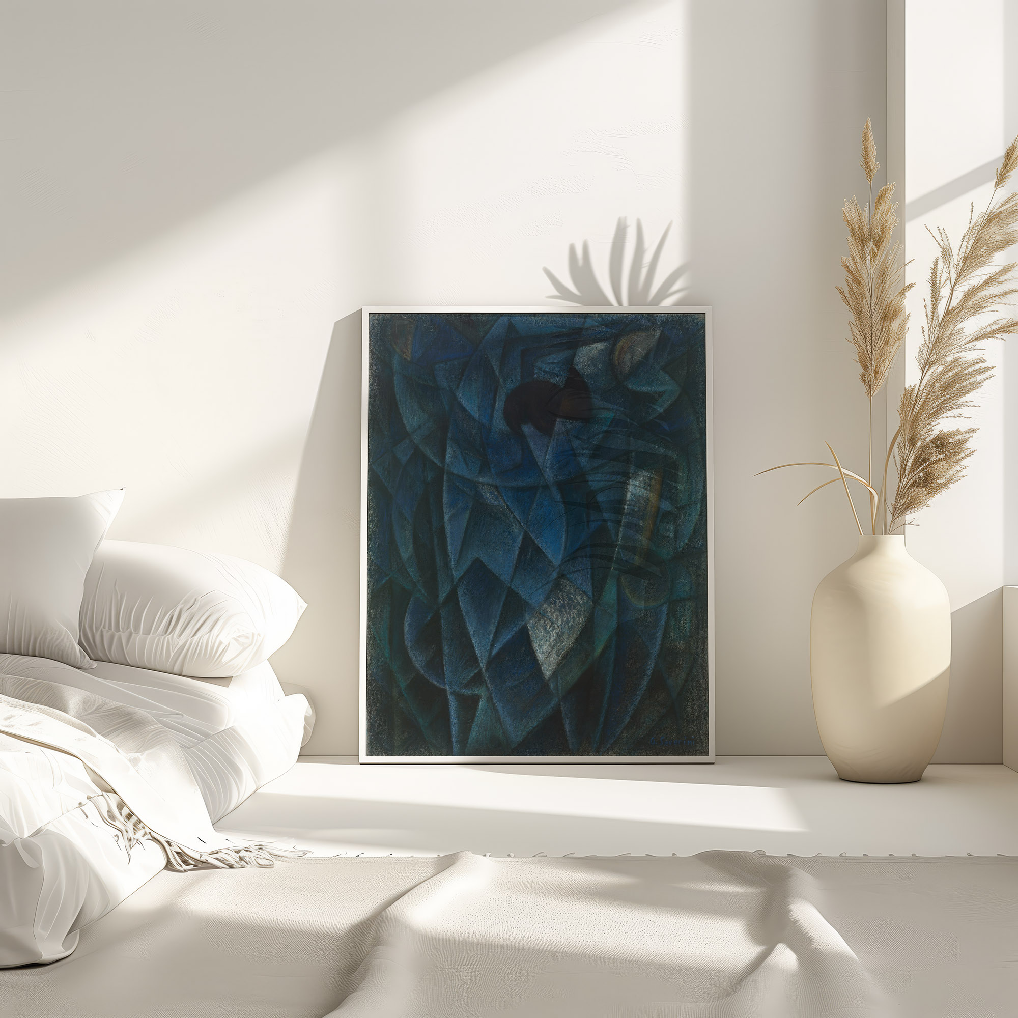 Gino Severini’s “Study for Sea = Dancer” offers an abstract representation of motion, embodying the essence of dance within a sea context. Shades of blue dominate the composition, reminiscent of deep ocean waters, while the fragmented geometry suggests the fluidity and grace of a dancer’s body. The interplay of light and dark creates depth in the print, highlighting the swirling forms that elicit a harmonious ballet of sea and dance. With its abstracted shapes and cool color palette, the work evokes the intersection of human expression with the natural world.
