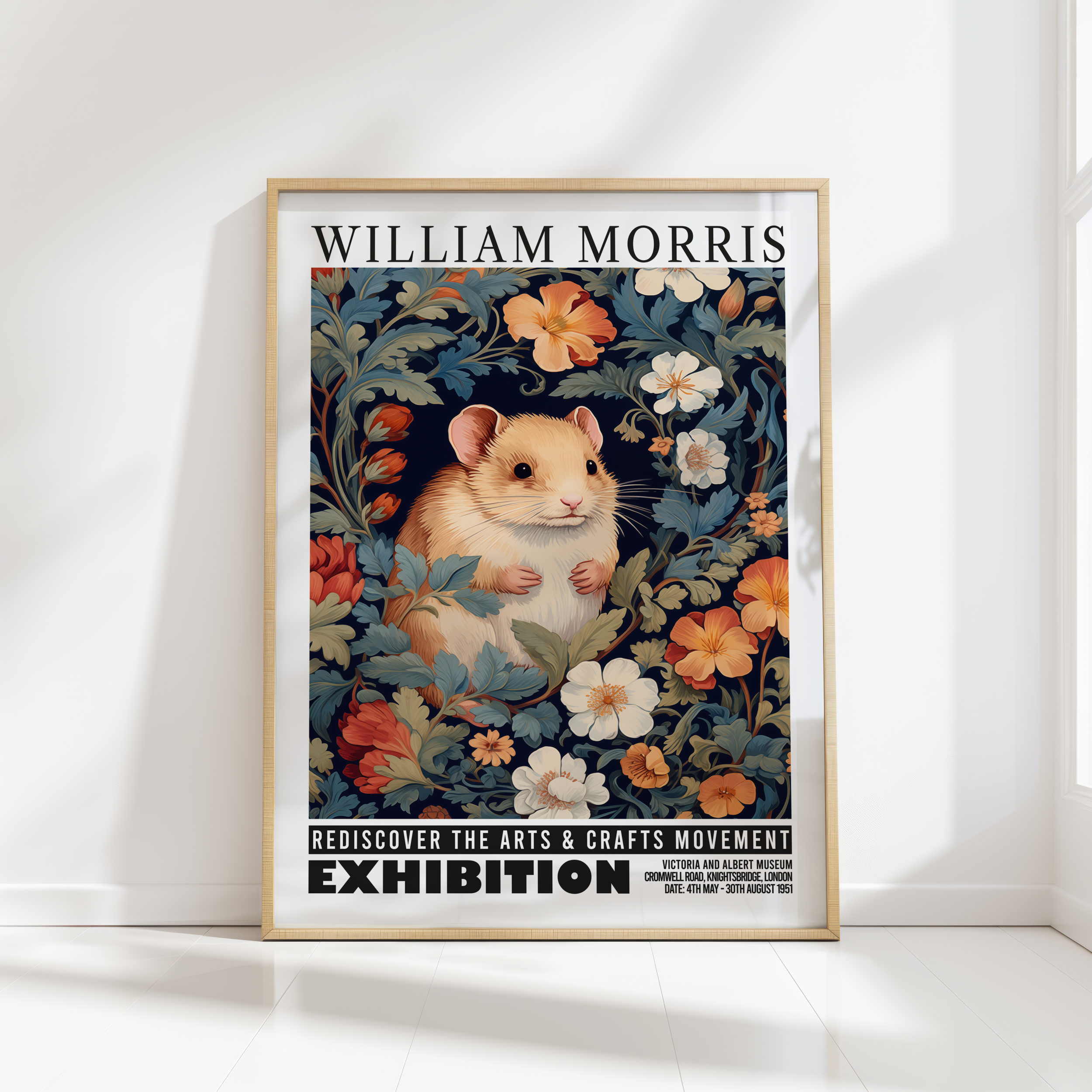 This elegant print captures the essence of the Arts & Crafts movement with a charming depiction of a hamster surrounded by an abundance of floral motifs. Rich in warm hues, the image conveys a sense of harmony between nature and art. Emphasizing craftsmanship, the design features detailed foliage and blossoms that pay homage to traditional textile patterns. This piece is a testament to the timeless appeal of nature-inspired artwork, combining animal charm with botanical beauty in a way that is both classic and captivating.