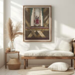 This elegant print depicts a stylized, decorative scene that centers on a solitary female figure within an intricate architectural setting. The artwork is characterized by its use of strong geometric patterns and sharp angles that contrast with the soft curves of the central subject. The striking interplay of shapes and lines creates a sense of depth and dimensionality. The color palette is subtle yet rich, with a predominance of browns, golds, and reds, which highlight the focal point of the design – the adorned figure that carries a mystical or symbolic resonance. The print presents a blend of art deco influences with an air of myth or fantasy, reflecting an appreciation for both sophistication and imagination.