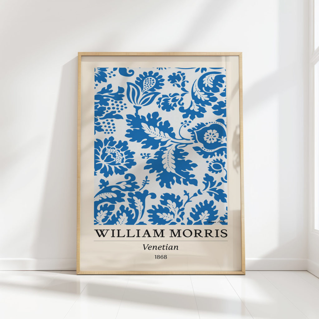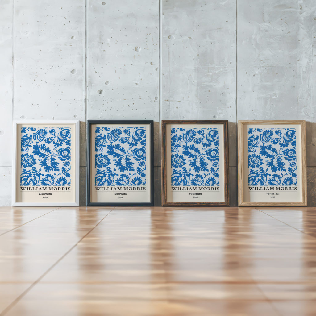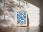This high-quality print captures the timeless elegance of a blue and white floral pattern, evoking the sophisticated charm of traditional decor. Its intricate botanical design is reminiscent of Victorian style, making it an ideal choice for those looking to add a touch of historical beauty to their home or office. The clean and crisp contrast between blue and floral motifs creates a serene yet captivating visual experience, suitable for many interior settings such as living rooms, studies, or hallways.