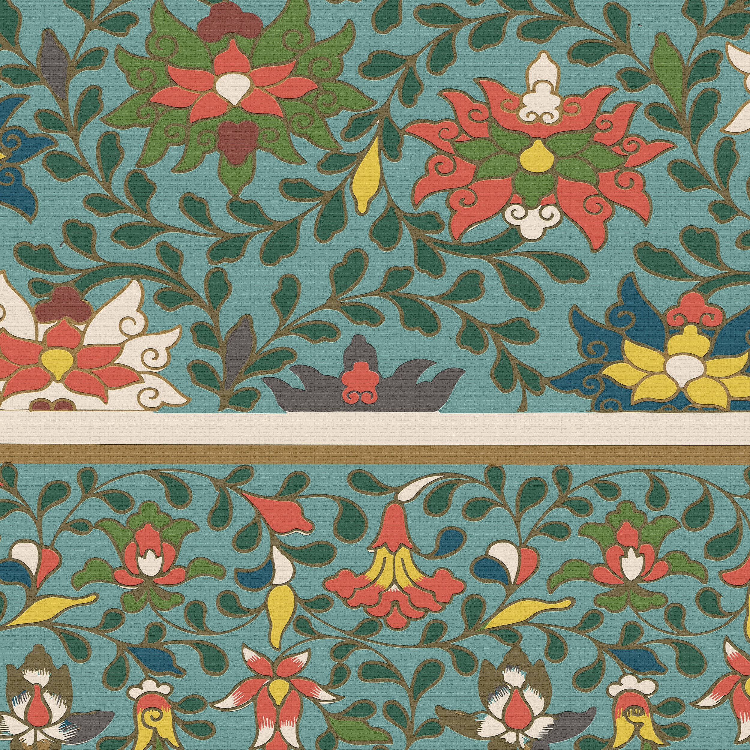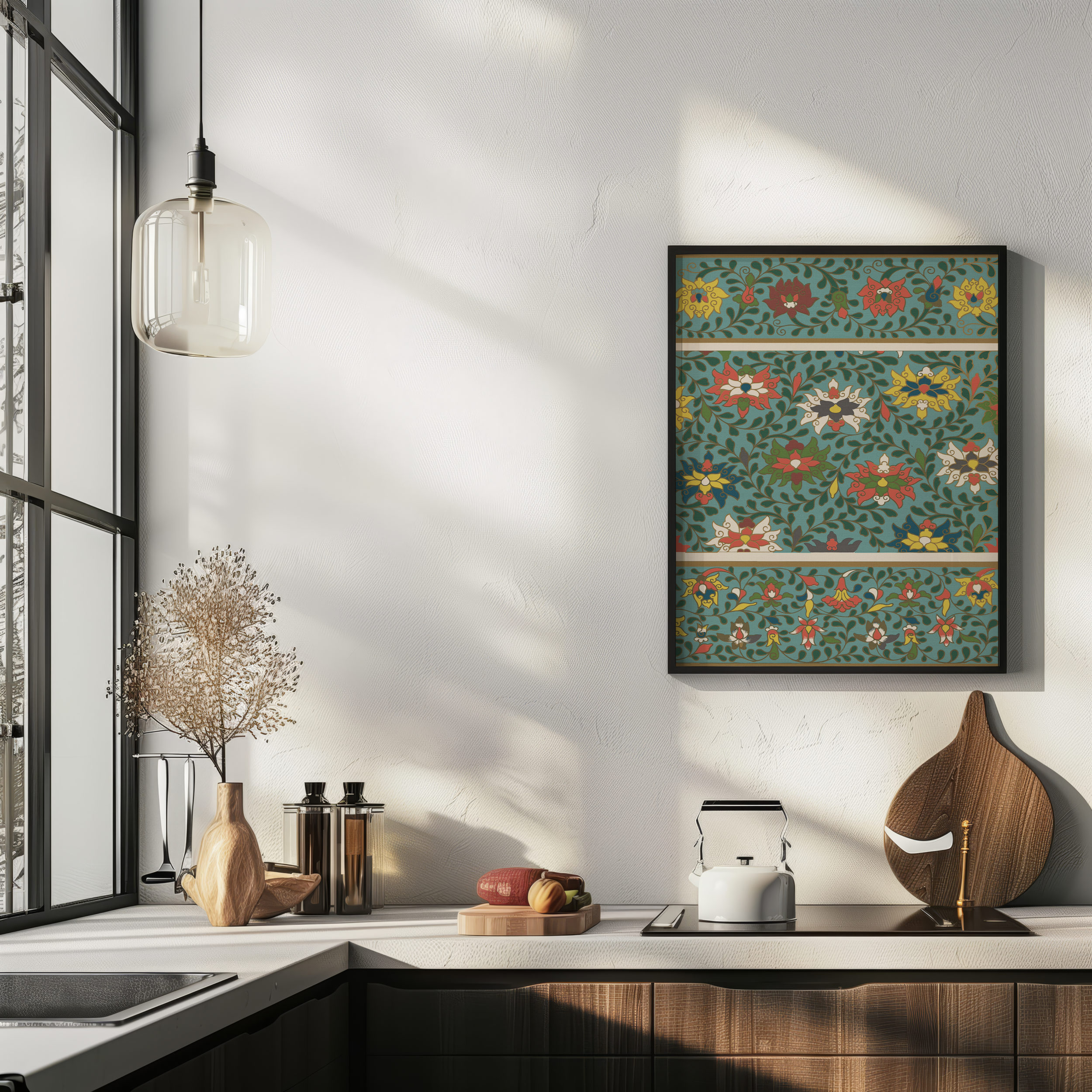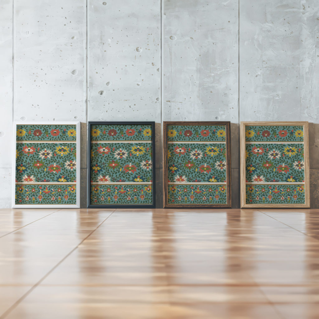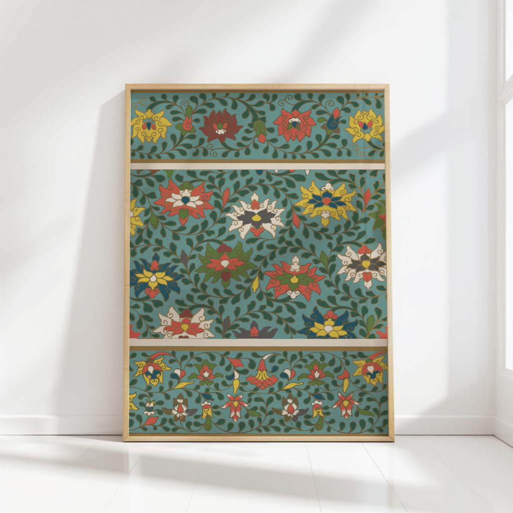 This vibrant print showcases a series of ornamental floral patterns laid out in horizontal bands. The intricate design features a variety of flowers and leaves in a rich palette of red, yellow, green, and white hues against a deep teal background. Each band is separated by slim stripes, adding to the structured elegance of the piece. The decorative elements are symmetrical and stylized, reflecting an eclectic taste with a nod to traditional floral motifs. This artwork brings a lively and colorful aesthetic to any space, perfect for adding a touch of nature-inspired beauty.