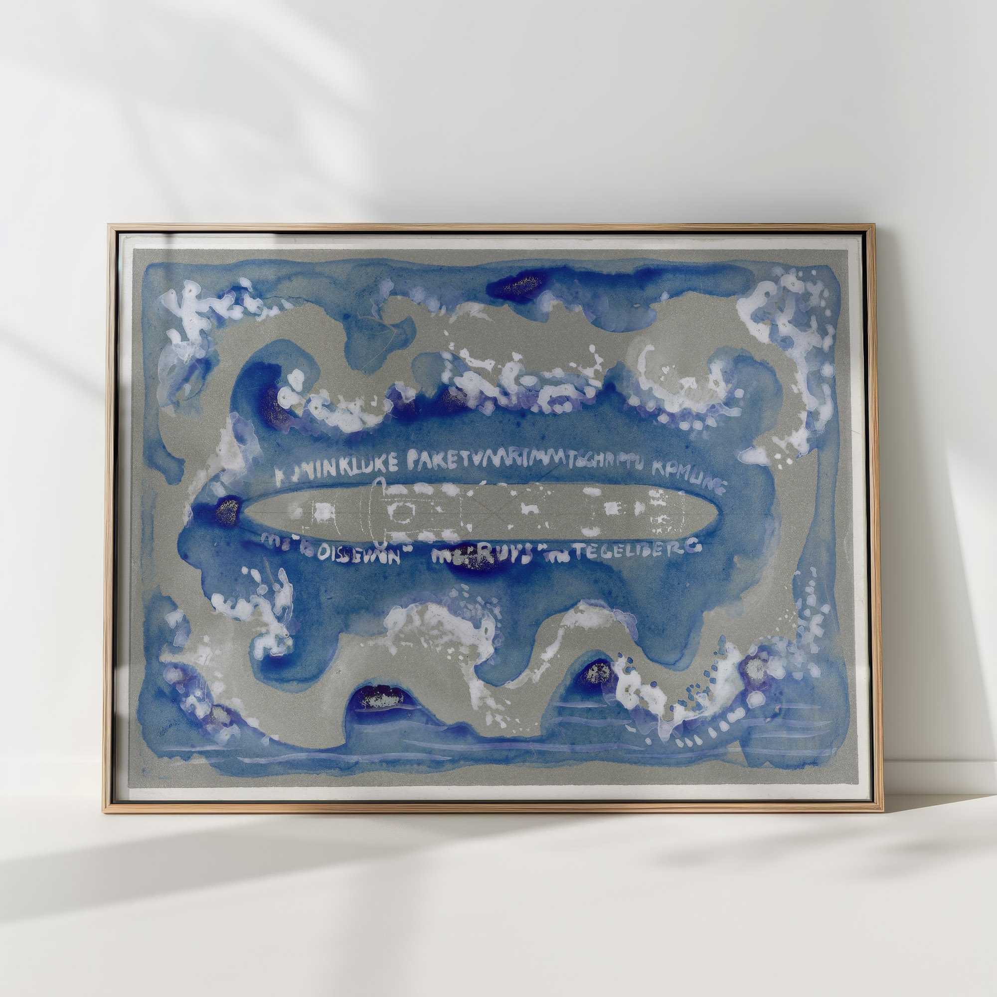 The print by Carel Adolph Lion Cachet displays a maritime theme with deep blue hues and undulating shapes suggestive of ocean waves. Enclosed within the aqueous design is a ribbon bearing stylized text, creating a harmonious blend of typography and natural forms. The aquatic motif and the flow of the design encapsulate the essence of sea travel and the elegance of early graphic design related to transportation.