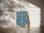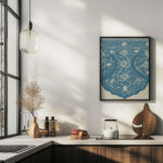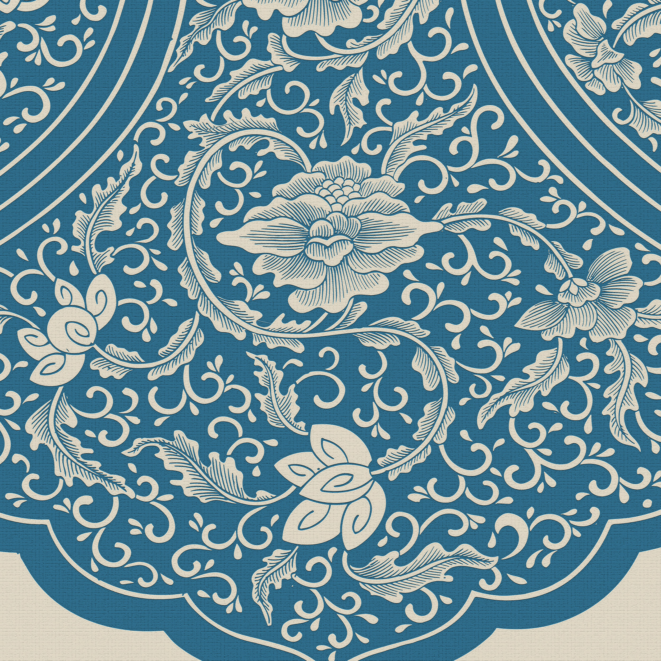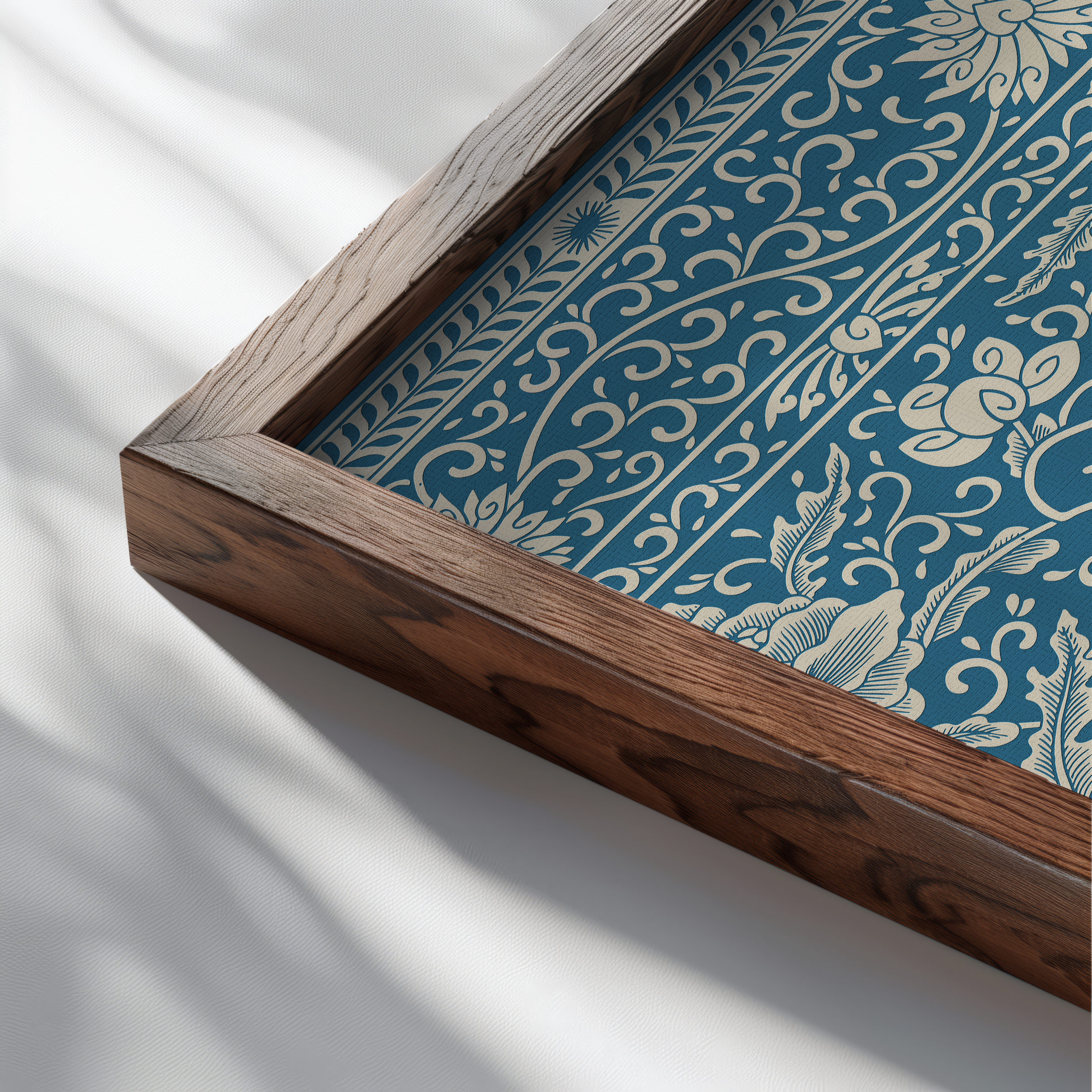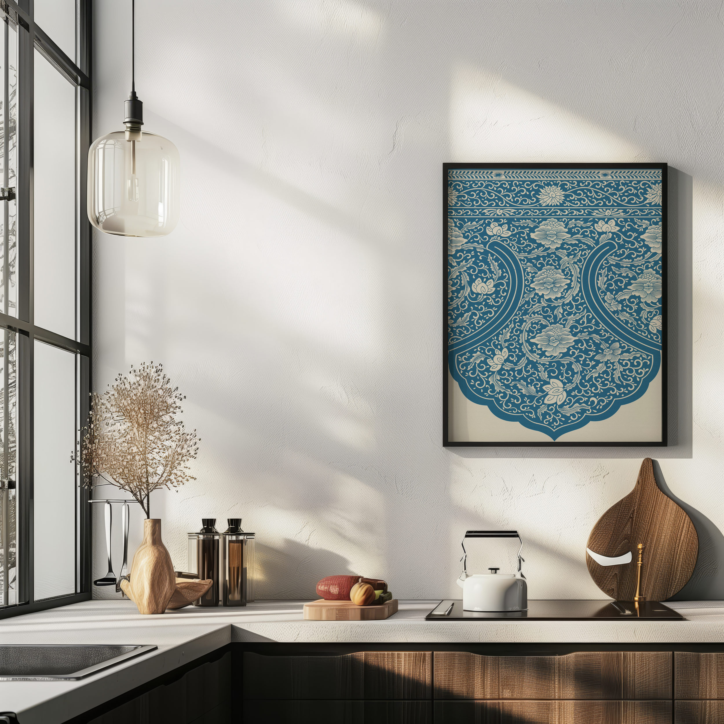 This print features a stunning array of ornate floral patterns, showcasing a rich blue color. Intricately detailed, the image presents a symmetrical design with scrollwork, leaves, and blooming flowers that exhibit Victorian elegance. Its cool blue shades add a serene yet sophisticated touch, suitable for enhancing the ambiance of any room. The composition is balanced with flourishing plant elements and structured geometric shapes, creating a harmonious visual experience. Ideal for collectors and decorators seeking a refined aesthetic, this print serves as a beautiful focal point in any interior setting.