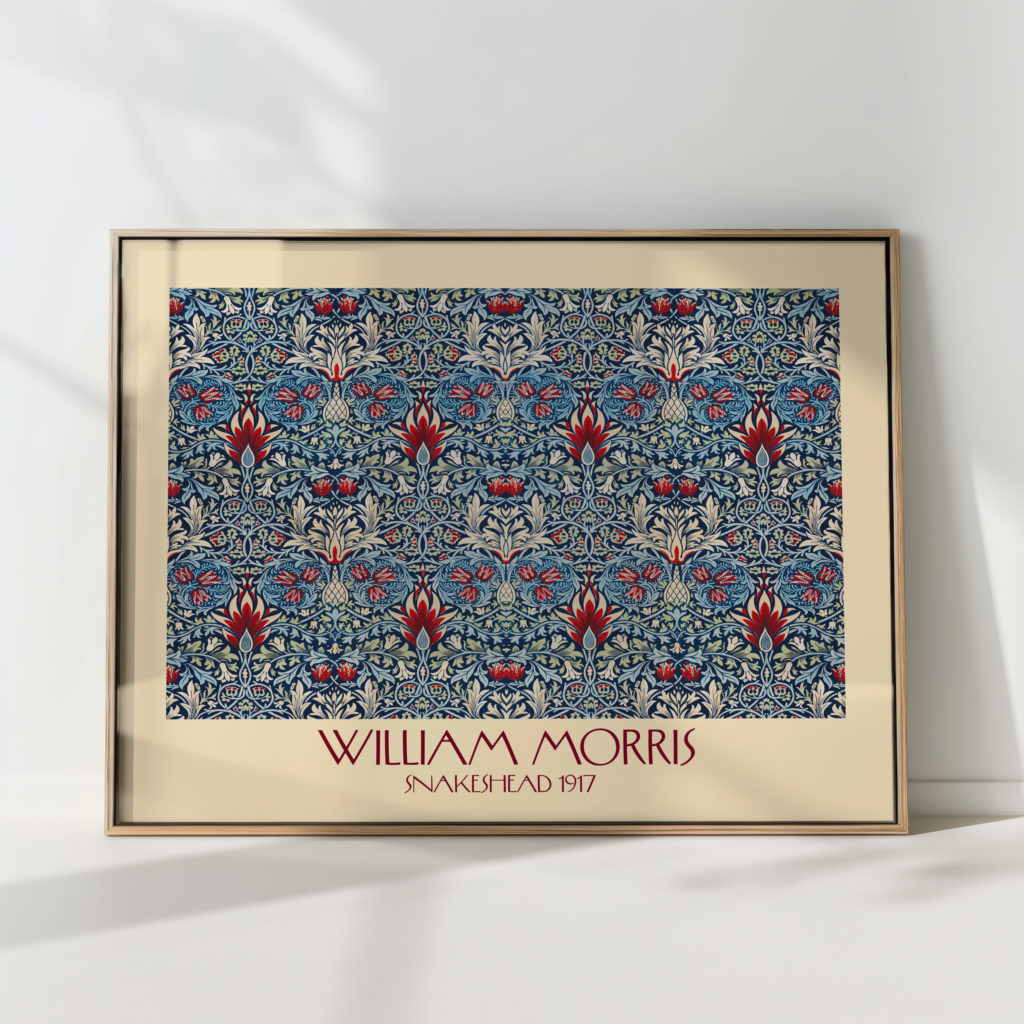This high-quality print features a sophisticated floral design with a complex arrangement of leaves and flowers, showcasing a symmetrical and geometric layout. The warm color palette consists of red, blue, and beige, with intricate details that create an elegant and timeless piece. This print would add a touch of Victorian charm to any interior, fitting well with both traditional and contemporary decors. The meticulous patterns are a testament to skilled artistry, perfect for those who appreciate detailed and ornate designs.