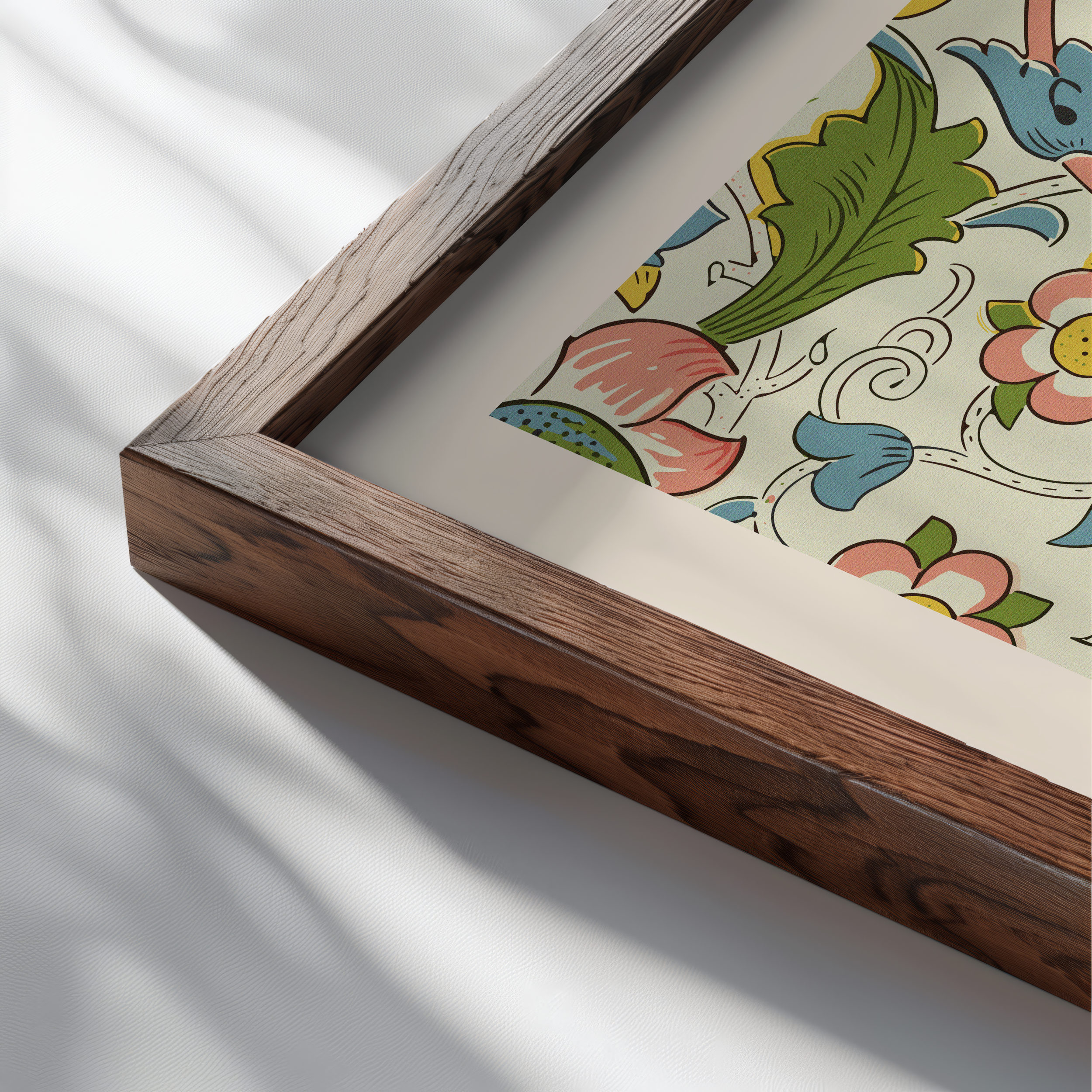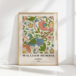 This print features a classic design by William Morris, showcasing an intricate array of flowers and foliage intertwined in an ornate pattern. The subtle color palette combines neutral backgrounds with pops of greens, blues, and warm tones, creating a harmonious and sophisticated composition. The Loddon design, with its detailed botanical elements and flowing lines, embodies a timeless elegance perfect for enhancing any living space or bringing a touch of Victorian charm to modern interiors.