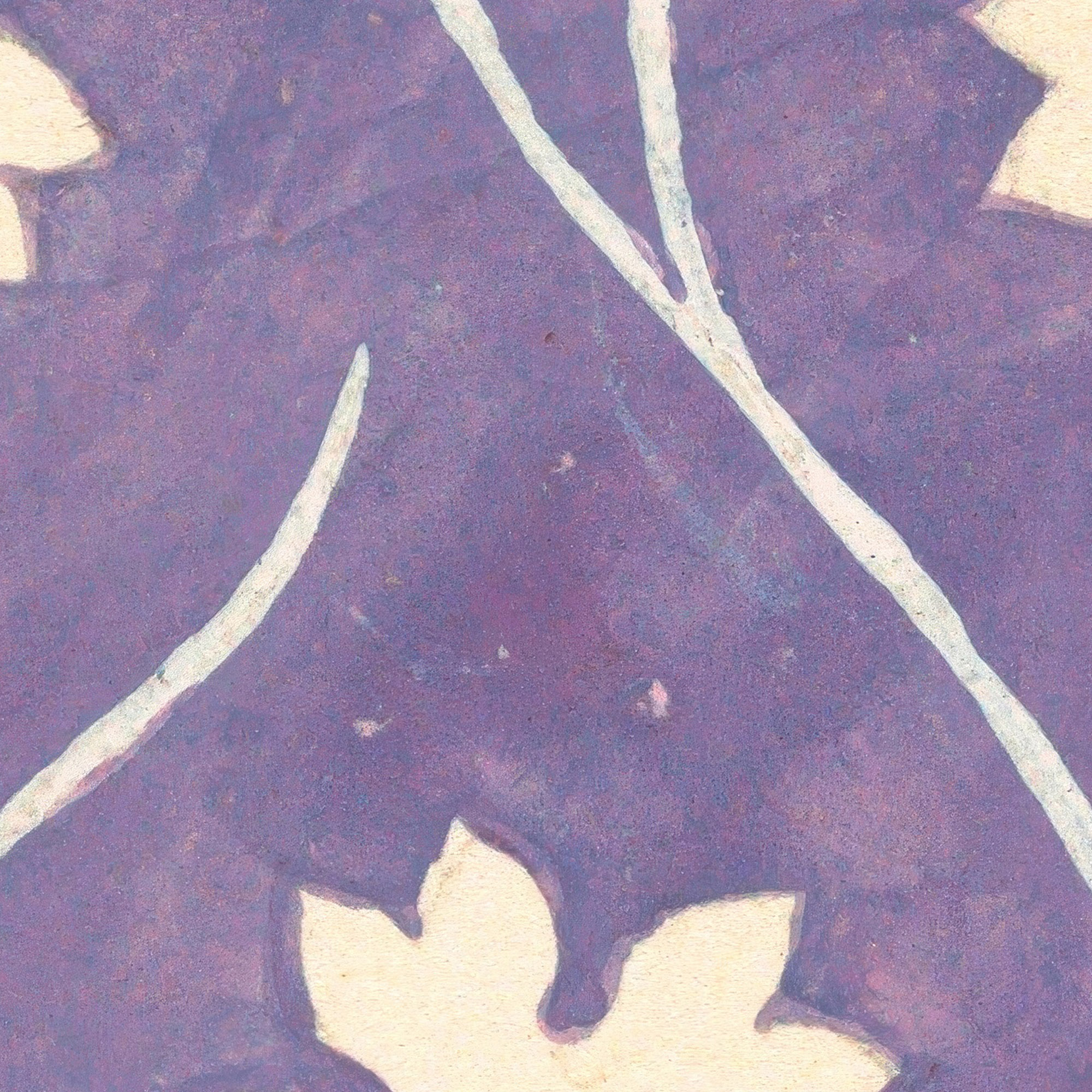 This image, titled “Floral design for printed textile” by an unknown author, features a repeating pattern of bold, white flowers connected by flowing, delicate lines against a rich purple backdrop. The design exudes a sense of organic elegance, with the floral elements and their associated foliage intertwined in a natural rhythm. The simplicity of the two-tone color scheme highlights the artistic detail and craftsmanship, conveying a timeless aesthetic appeal typical of textile designs from the historical period in which it was created.
