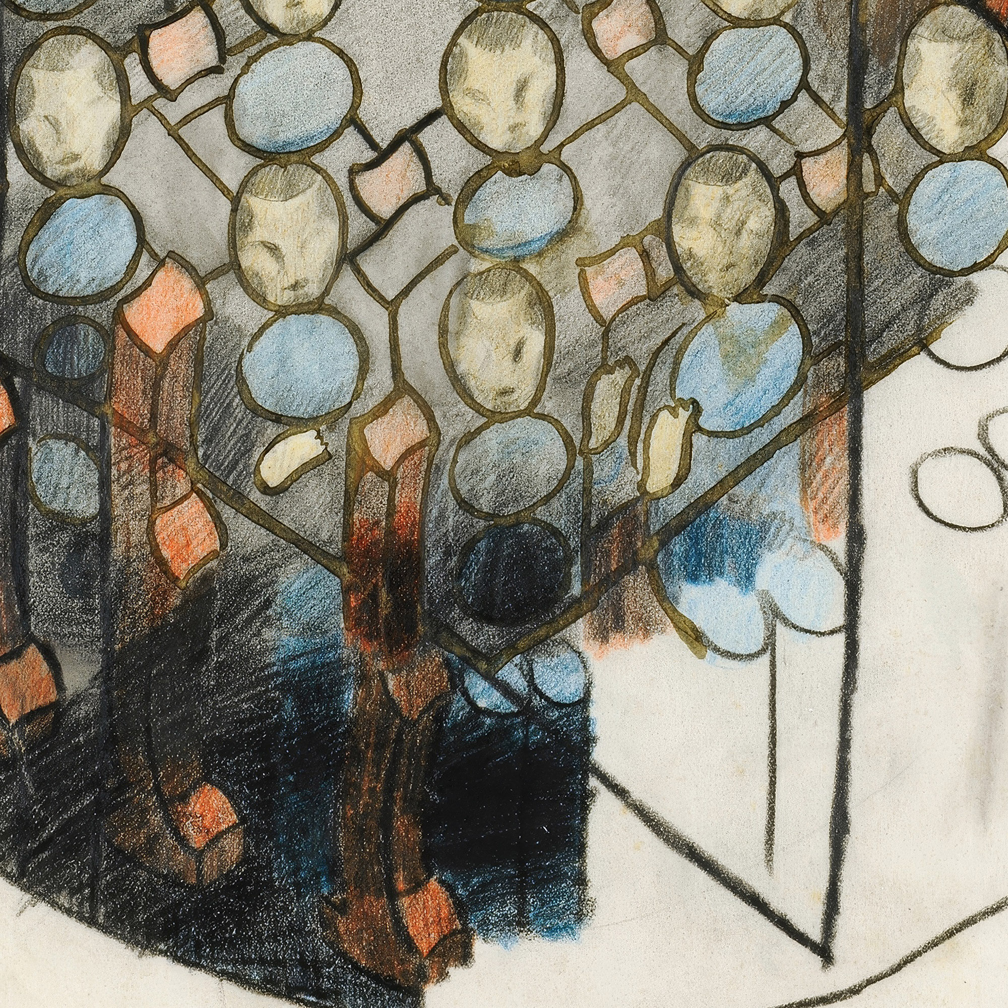 The print “Im Münster (Erwartung). Entwurf für das Glasfenster im Zwinglihaus Zürich-Wiedikon” designed by Otto Meyer-Amden, employs muted colors with prominent black outlines, creating a sophisticated and intricate mosaic. Circular motifs dominate the piece, reminiscent of the traditional craftsmanship of stained glass. The precise arrangement of shapes and lines conveys a sense of harmony and contemplation, effectively embodying a spiritual and reflective atmosphere. The stylized representation and abstract quality of the work underscore its artistic significance and the contemplative mood it is intended to evoke within a religious context.