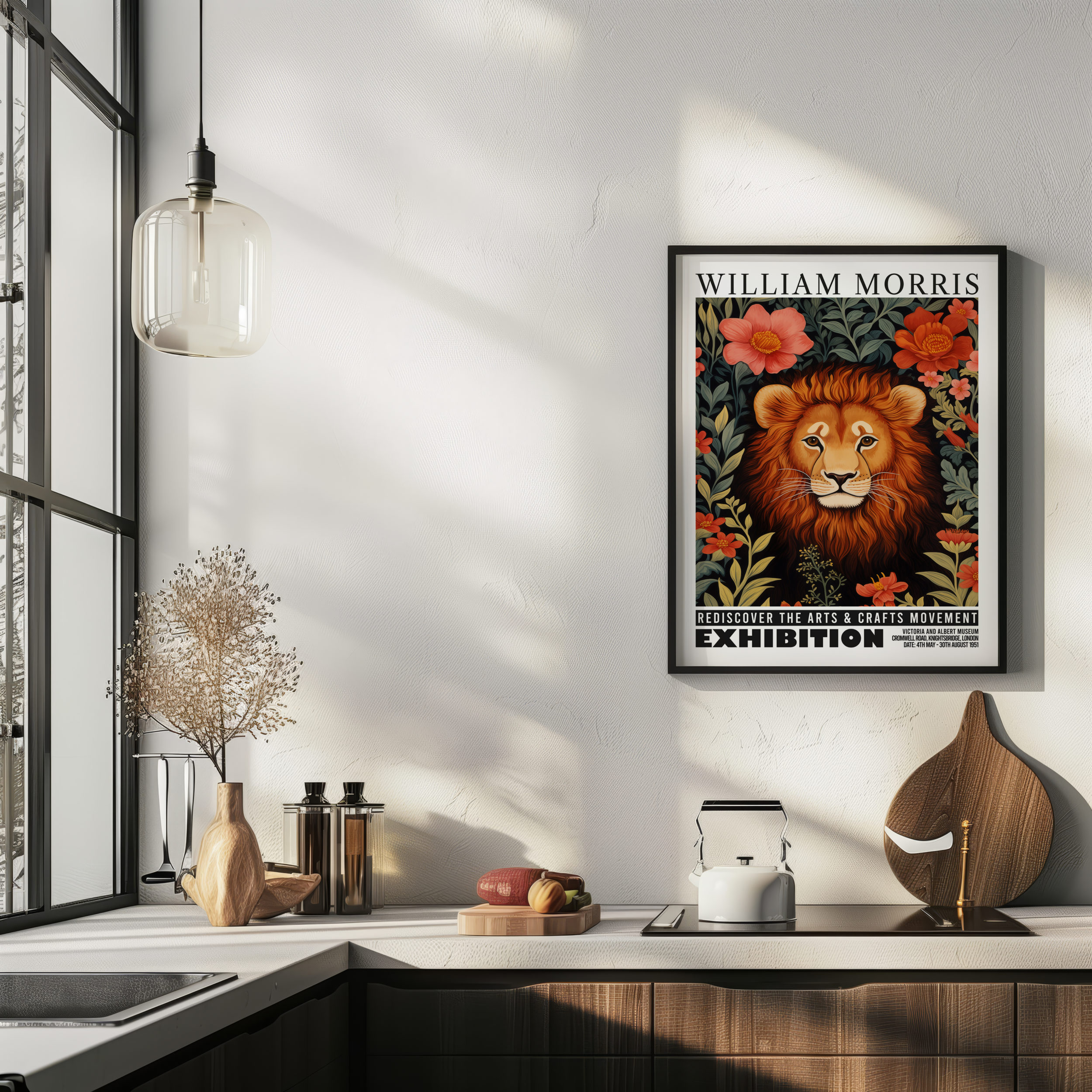 This print showcases an elegant lion’s head, a tribute to the celebrated artist William Morris. The majestic animal is framed by an array of lush flowers in a dense, organic pattern characteristic of Morris’s work. The warm color palette accentuates the floral elements, inviting a Victorian charm to any space. Ideal for adding a touch of sophistication, this piece easily becomes the focal point of a room, perfect for those who appreciate history, art, and nature entwined in a luxurious display.
