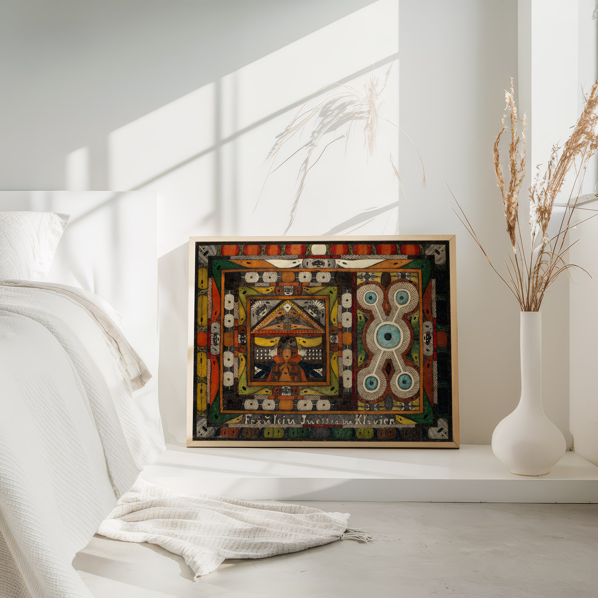 This print by Adolf Wölfli presents a complex, symmetrical array of patterns surrounding a central figure, possibly representing Fräulein Iness. Vivid colors and meticulous detail craft a deeply textured tapestry of shapes and motifs that play with visual perception. The ornate composition juxtaposes human elements with abstract design, creating an immersive, engaging visual narrative rich with symbolic elements. This dense mosaic of visuals provides a glimpse into Wölfli’s elaborate inner world.