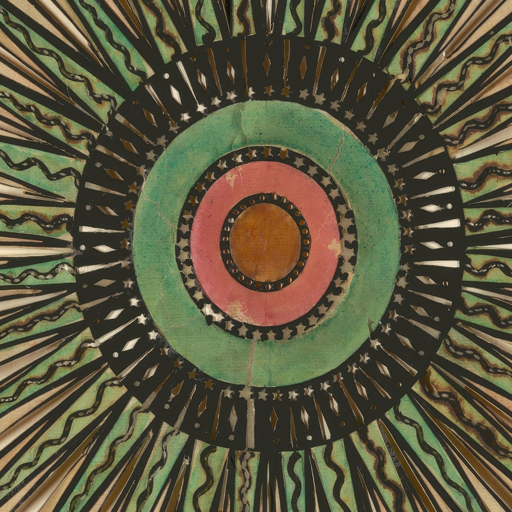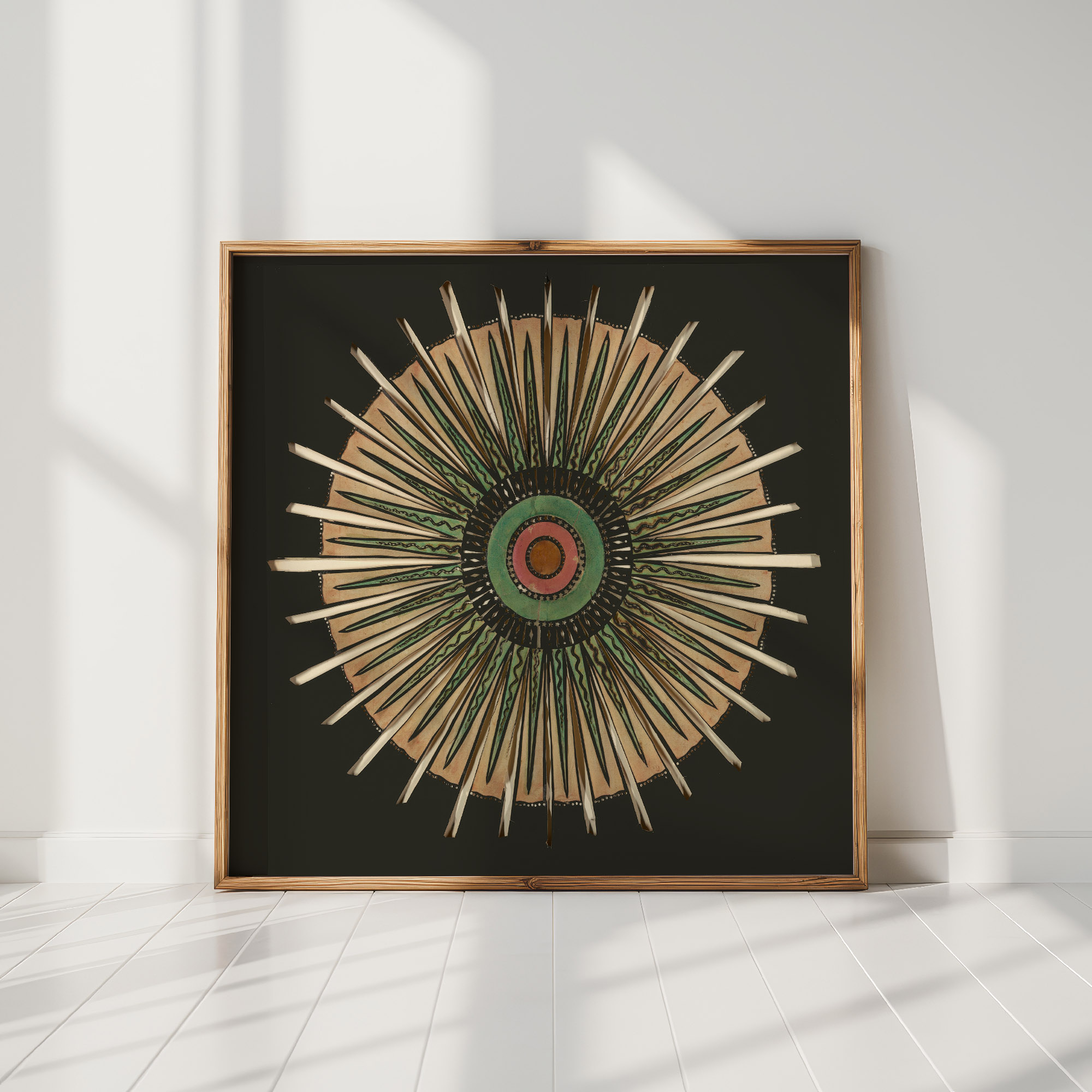 This print, titled “Moon (ca. 1780) – Unknown,” showcases a captivating concentric circular design at its center, with layers of varied textures and color gradients. Radiant lines emanate from the core, creating a dynamic sense of movement, reminiscent of cosmic rays or the intricate details of celestial bodies. The contrasting shades and meticulous linework contribute to a visually striking piece, inviting contemplation of the cosmic mysteries it might represent.