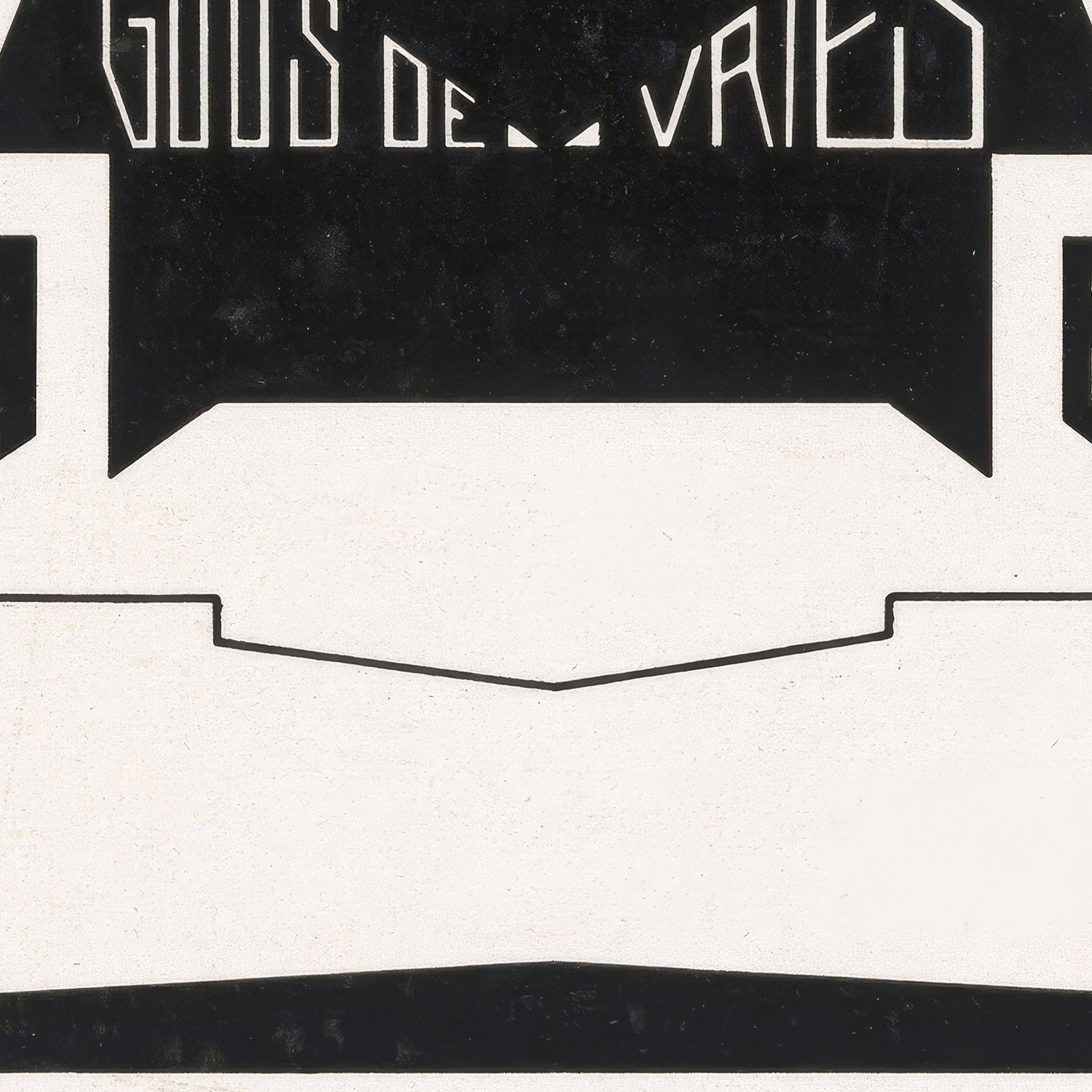 This print, titled “Ornament Guus de Vries 1894- 1919,” created by Samuel Jessurun de Mesquita, showcases a strong visual contrast with bold geometric patterns. A striped canopy-like structure is centered above the stylized text, creating an illusion of depth and emphasizing the name within. The linear style and usage of negative space are distinct, contributing to an aesthetic that is both striking and emblematic of certain art movements from the early 20th century.
