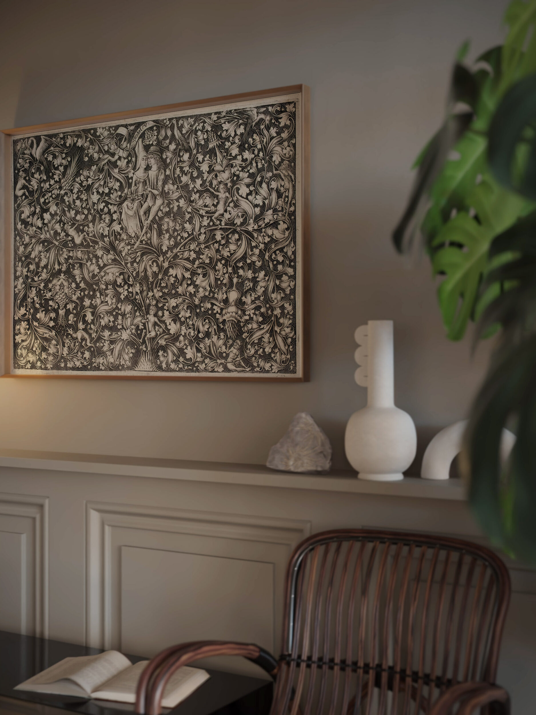“Ornament with lovers” by Israhel Van Meckenem is an elaborate creation depicting a pair of lovers at the center, enveloped by a lush array of foliage and whimsical beings. The detailed foliage is teeming with life, blending with mythical creatures that appear almost camouflaged within this tapestry of motifs. The intricate patterns and the composition create a harmonious scene that teeters on the edge of fantasy. The central figures are poised, adding a serene human element to the wild, flourishing environment around them. This print presents a fine example of detailed craftsmanship, evoking a sense of wonder and intricate storytelling through its visual elements.