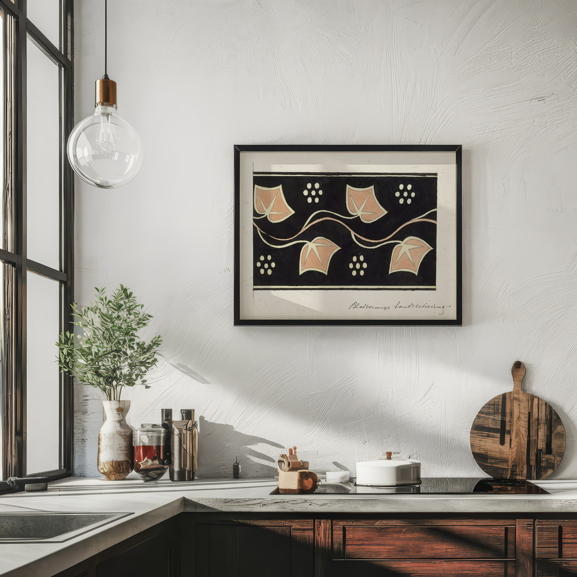 Johanna van de Kamer’s print “Bandversiering met bladeren” presents an elegant and organic composition. Stylized leaves in a pale hue are connected by sinuous lines that suggest a vine, creating a rhythmic flow across the piece. Set against a deep, contrasting backdrop, the artwork combines natural elements with geometric dot accents, resulting in a harmonious and decorative visual that exudes tranquility and a sense of natural growth. The design is suggestive of the Art Nouveau style’s influence, known for its embrace of natural forms and curves.