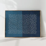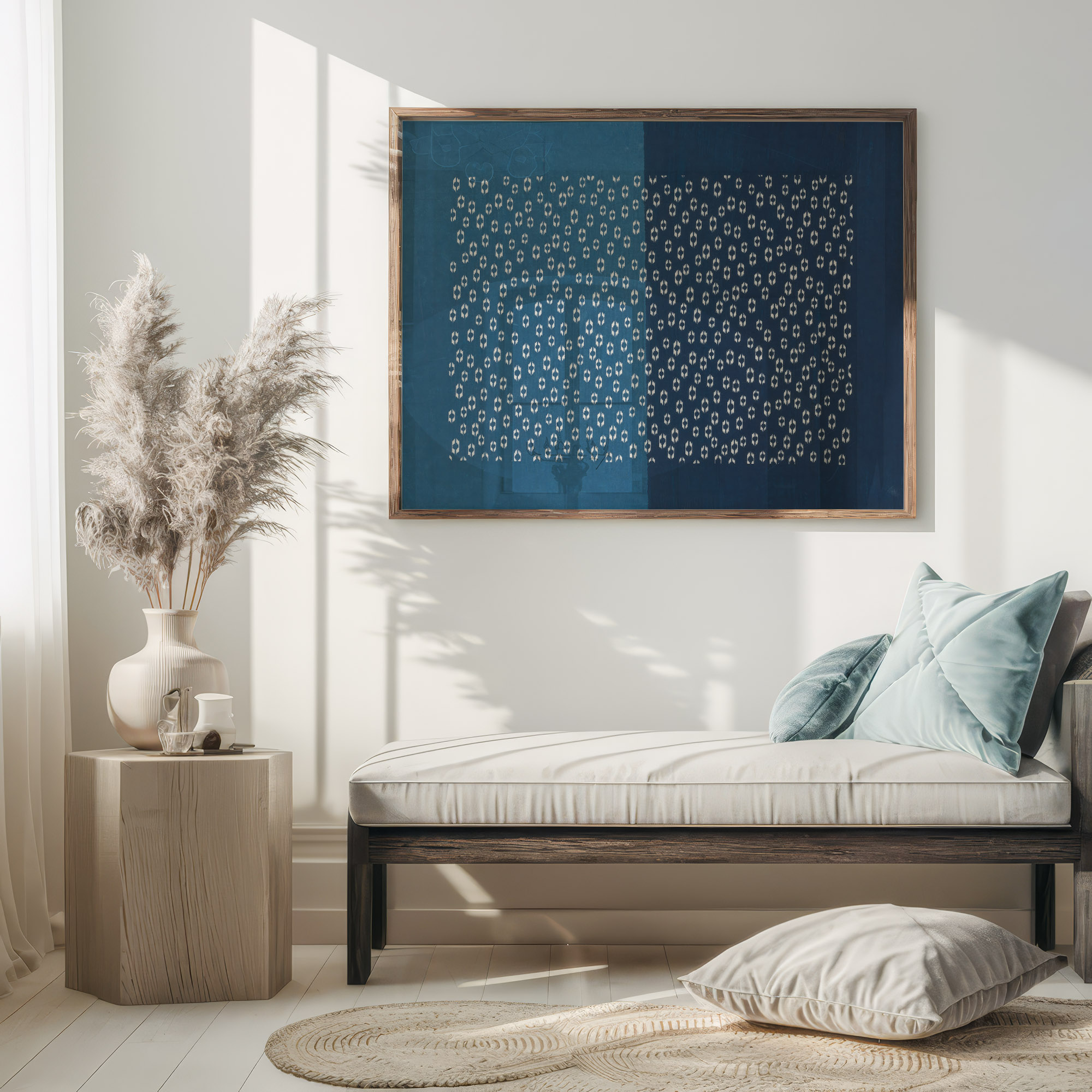 This striking print presents a study in contrasts, with two distinct blue tones partitioned by a bold hexagonal pattern. The abstract geometric composition plays with perspective and depth, as the white hexagons seem to float above the colored background. The print evokes a sense of order and precision, while the careful arrangement of shapes generates a dynamic visual rhythm that captivates the viewer.