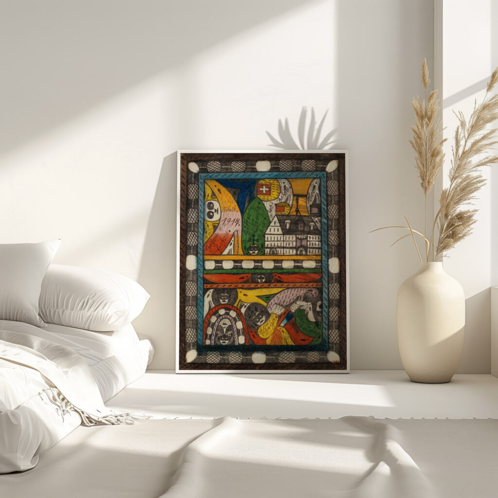 Adolf Wölfli’s creation, “Der Zohrn, Schiiga und Land=Jäger,” is a vibrant amalgamation of various elements that together form a visually arresting tableau. Intricate patterns and bold colors frame a composition that includes buildings resembling a townscape, swirled with abstract and figurative details. Notably, faces with expressive features emerge from within the interwoven forms, intriguing the observer. Geometric shapes, notably circles and curves, dominate the visual language, hinting at an underlying structure to the apparent chaos. Prominent within the piece is the presence of the Swiss flag, suggesting a connection to Wölfli’s Swiss heritage, all skillfully rendered in a dense, folk-art style.