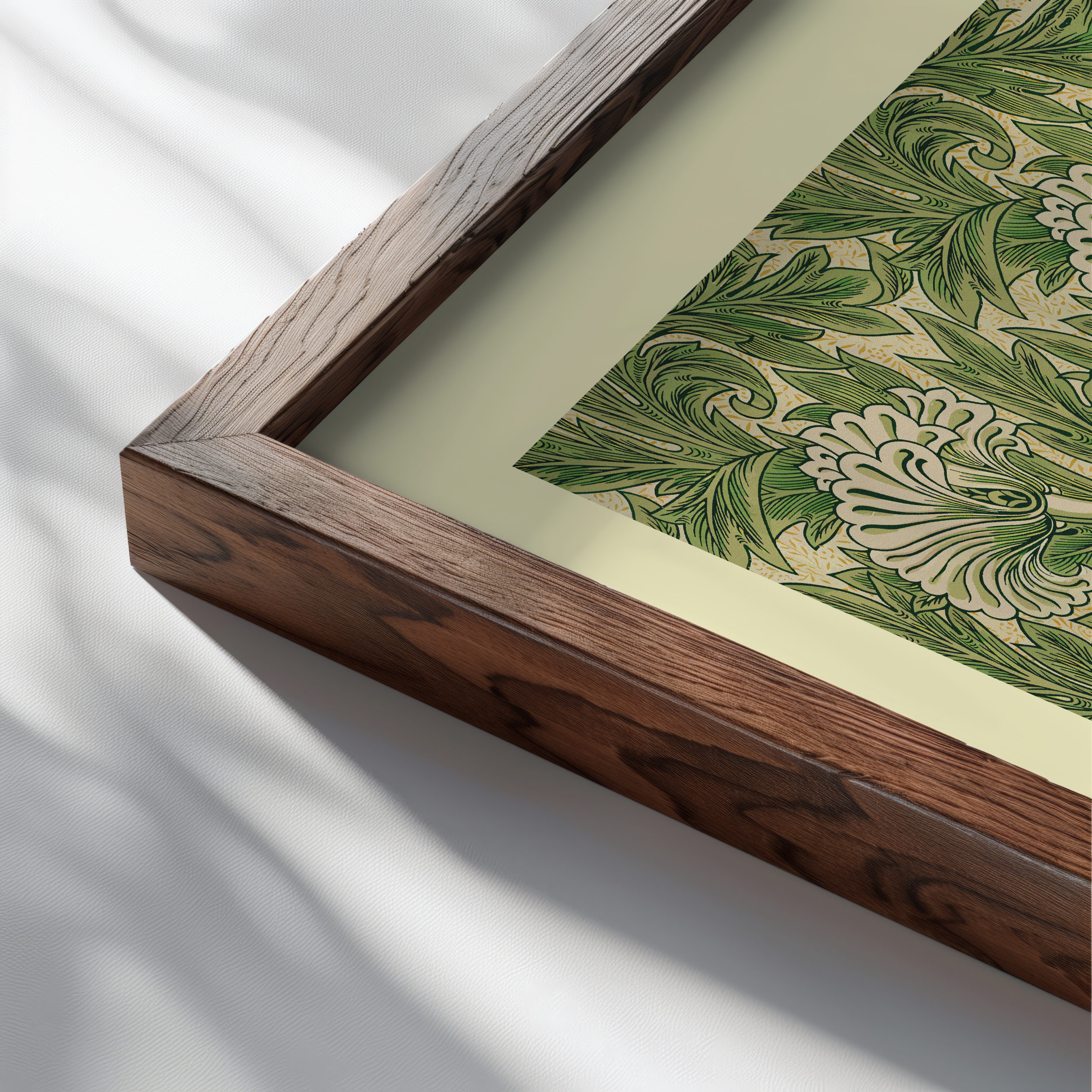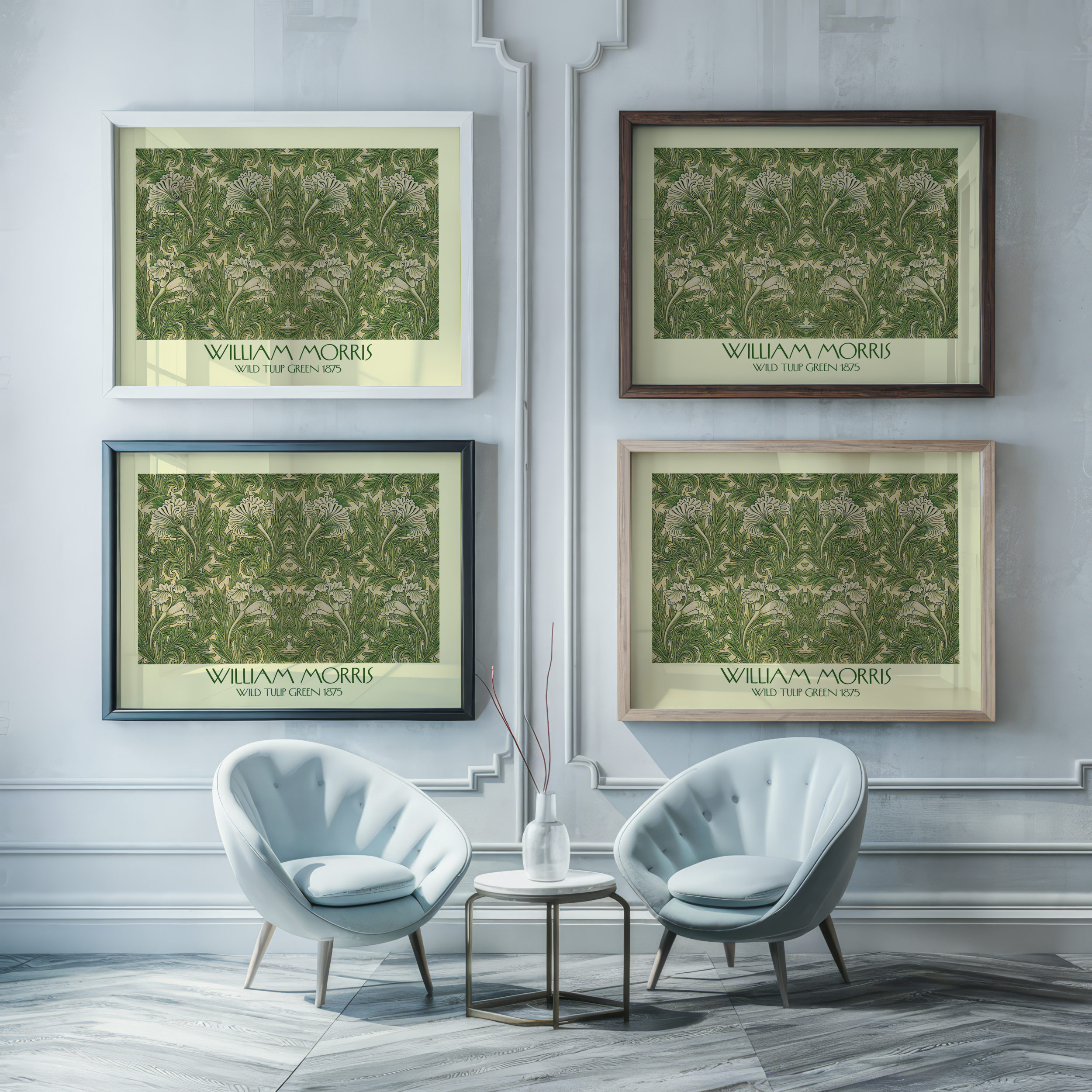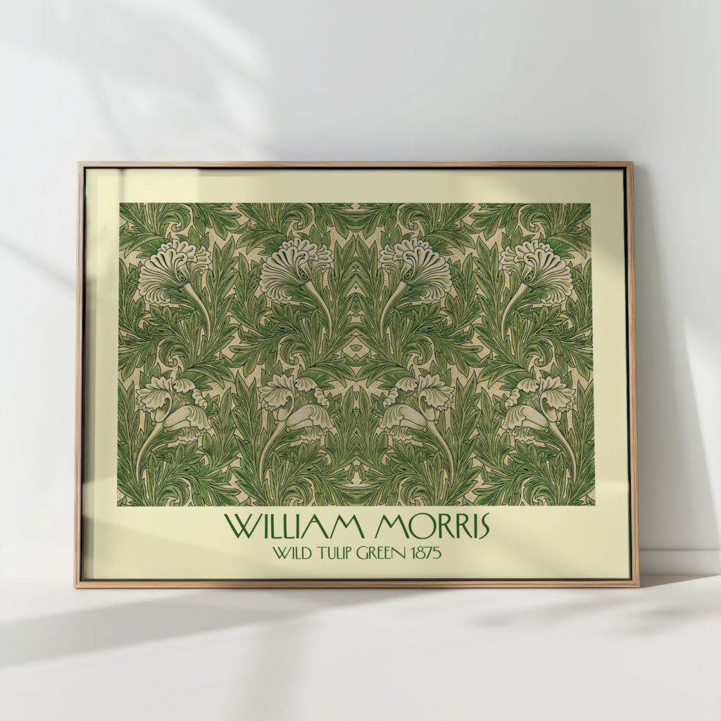 This elegant print features the timeless design of William Morris with an intricate pattern of green tulips and foliage. The symmetrical composition and the detailed depiction of plant life evoke a sense of harmony and sophistication, creating a captivating visual for any space. This piece is a must-have for those who appreciate classic designs with a botanical theme.