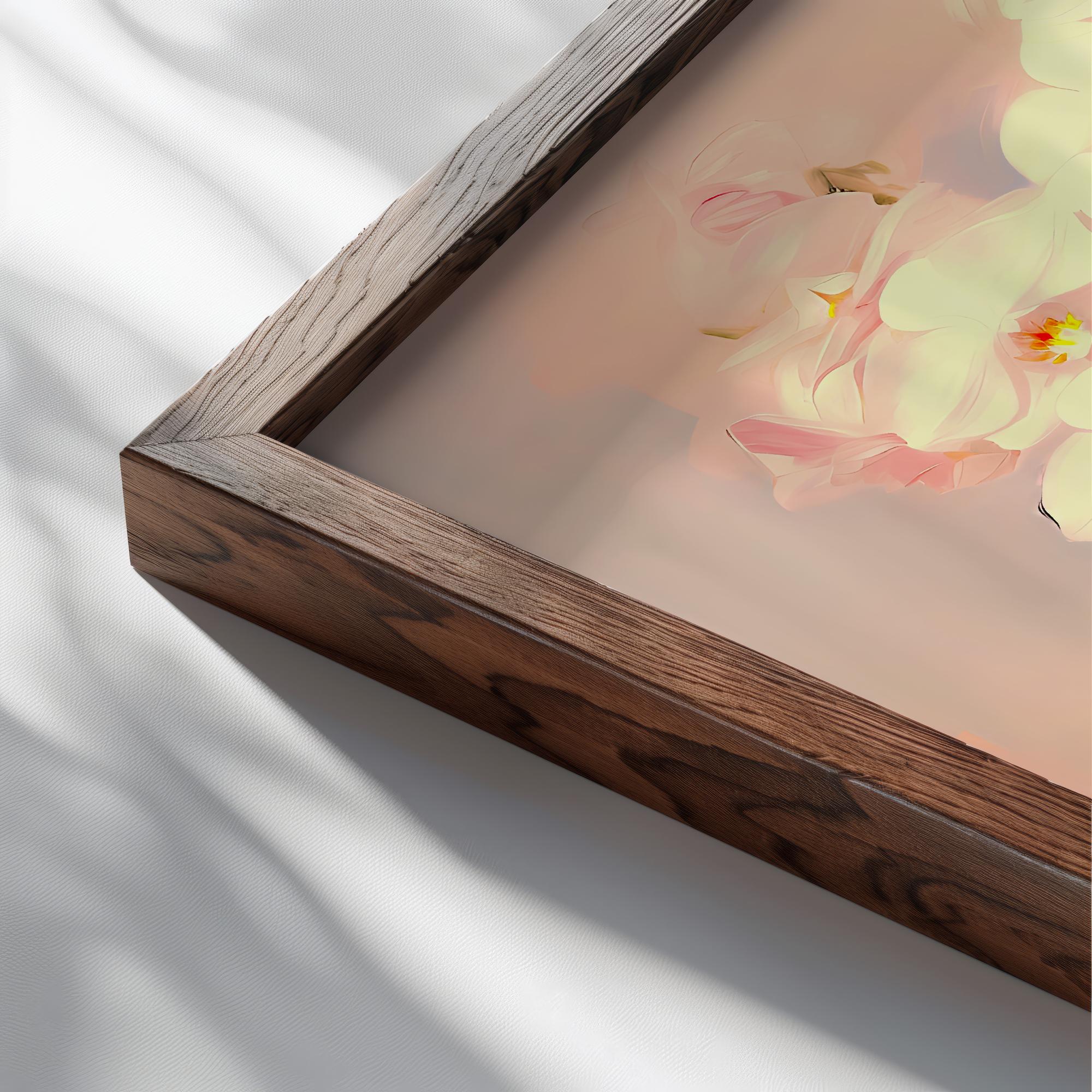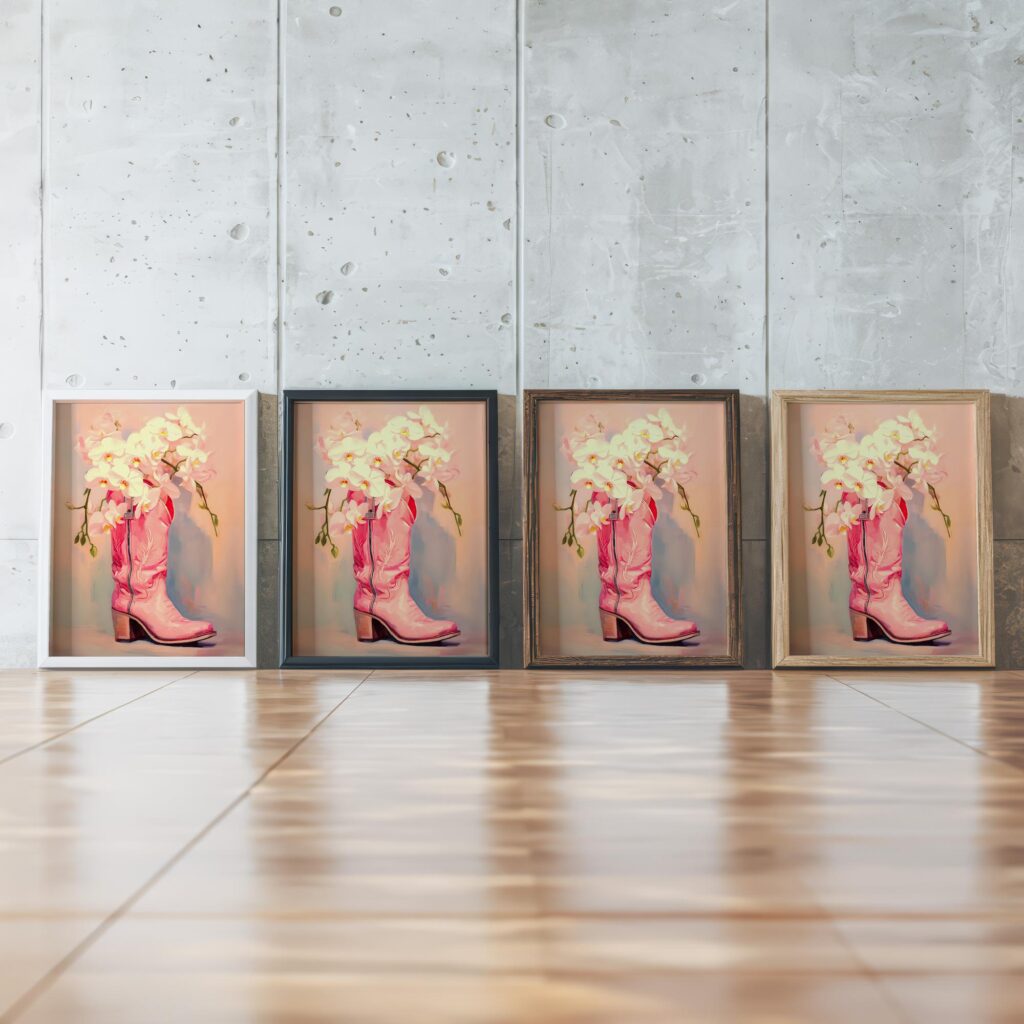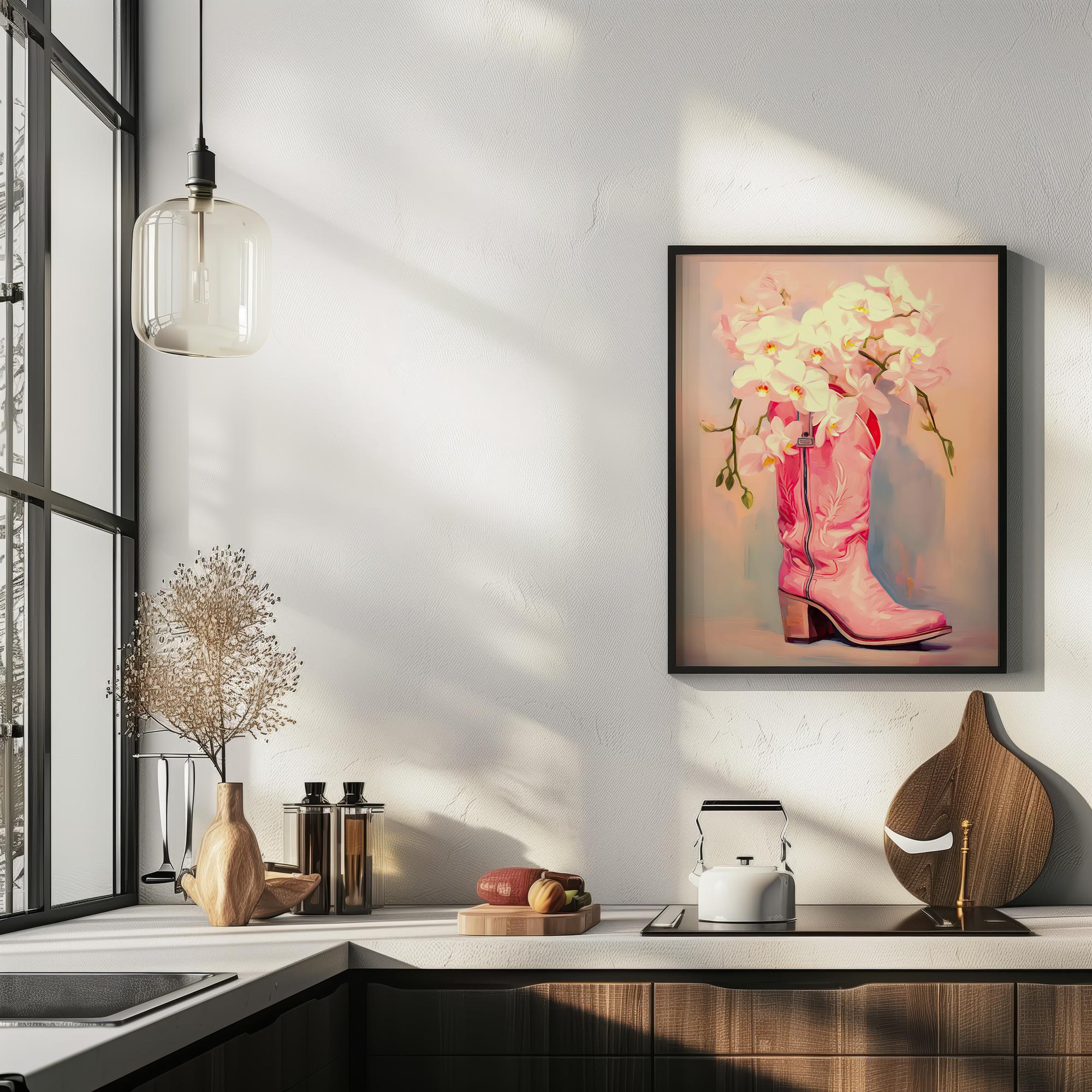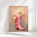 This print showcases a vibrant composition where nature meets fashion: a bouquet of delicate white orchids spilling elegantly from a stylish pink cowboy boot. The soft pastel background accentuates the flowers’ purity and the boot’s detailed texture. Perfect for adding a whimsical touch to any space, this print balances rustic appeal with contemporary fashion, creating a unique visual story. Suitable for modern home or office decor, it’s a charming conversation starter that invites viewers to appreciate the unexpected combination of elements.