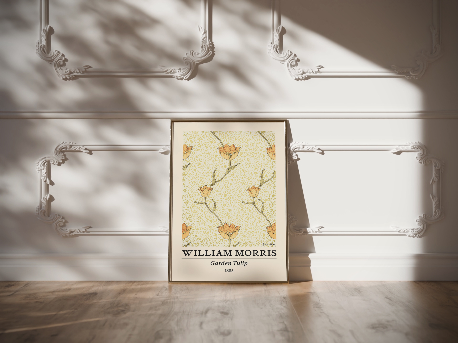 This print features the iconic Garden Tulip design by William Morris, a celebrated figure in the decorative arts. The artwork showcases elegant tulips in a stylized form, set against a detailed backdrop of intricate foliage. The use of neutral colors complements the sophistication of the piece, making it a perfect addition to any room seeking a touch of Victorian elegance. The symmetry and repetition of the floral pattern create a harmonious visual experience, embodying the beauty of nature with a historic artistic flair.