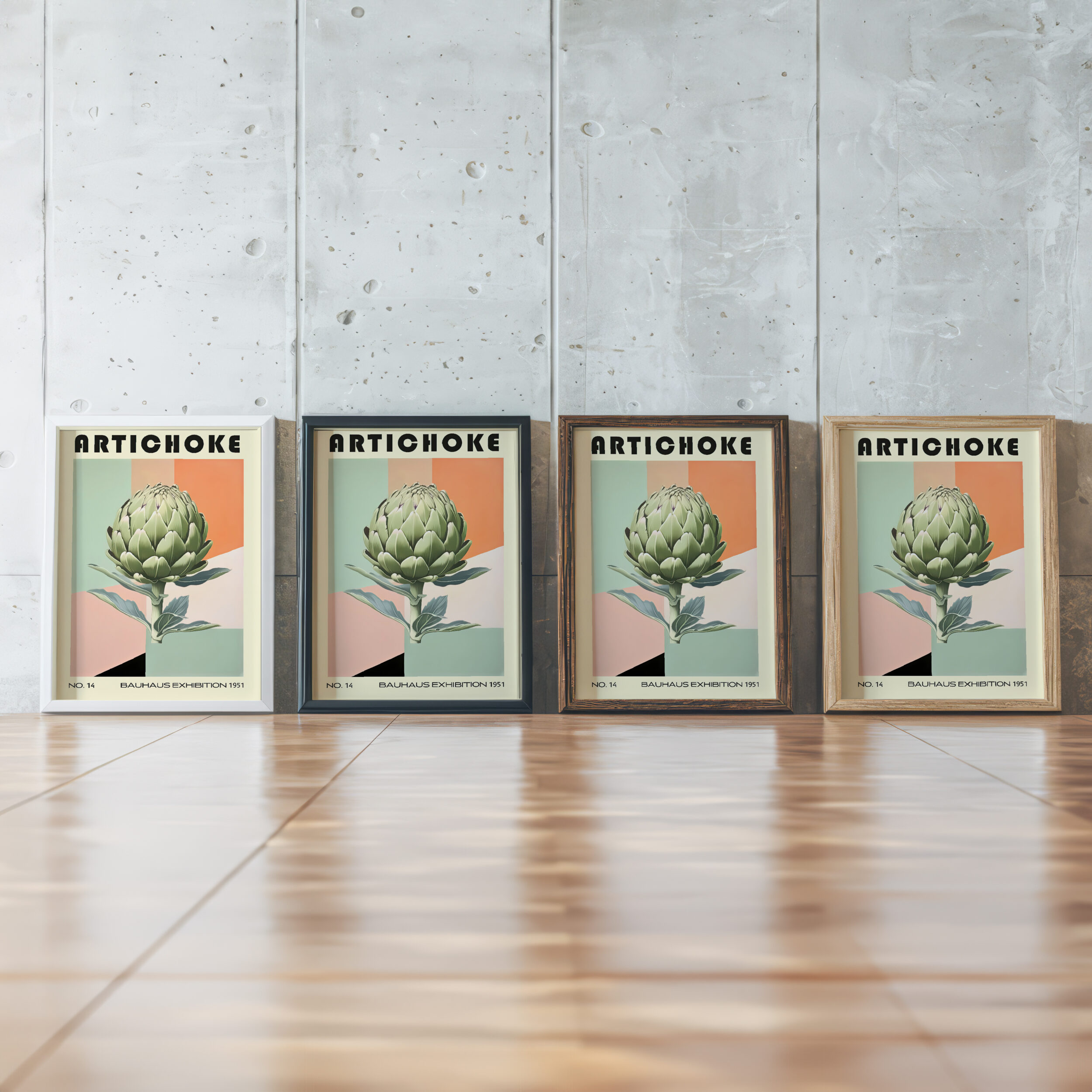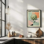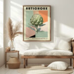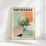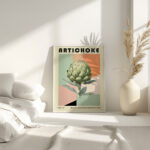 This striking print features a large artichoke illustrated in a Bauhaus-inspired design, making it a perfect addition to any art lover’s collection. The art piece showcases a blend of geometric shapes and soft neutral tones that create an elegant and sophisticated look. The central artichoke is rendered with attention to detail, highlighting its natural beauty and making it stand out against the abstract background. This unique print would effortlessly complement a contemporary or minimalist decor, adding a touch of elegance and modernist charm to any living space or gallery wall.