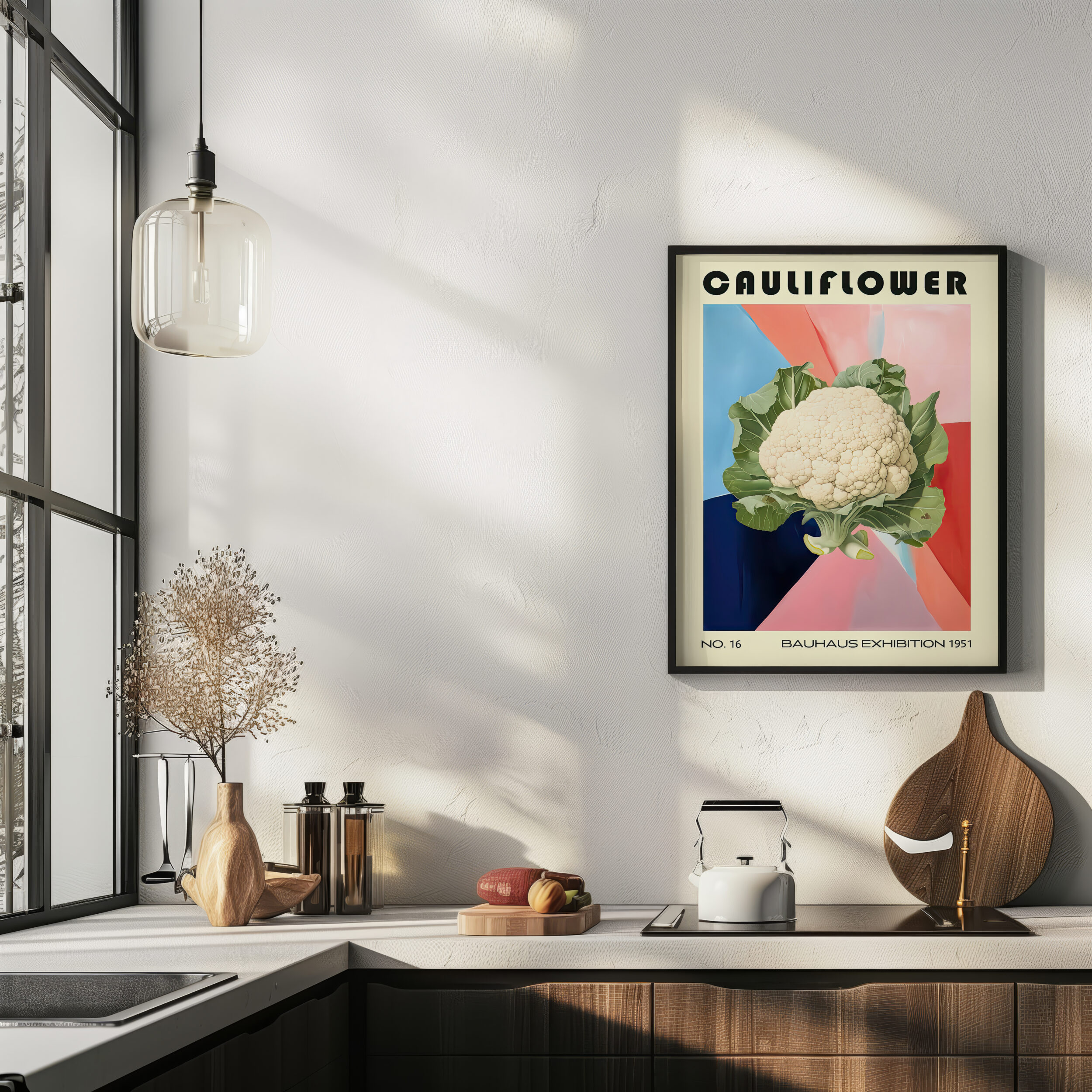 This striking print features a beautifully rendered cauliflower taking center stage against a backdrop of vibrant color blocks reminiscent of Bauhaus design. The sharp contrast of organic shapes with geometric abstraction creates a dynamic composition that’s sure to evoke conversations. This piece effortlessly combines the natural beauty of vegetal elements with a bold, modernist aesthetic. Perfect for those looking to infuse their living space with a touch of contemporary vibrancy and a nod to iconic design movements.