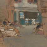 The “Bead Stringers (1880) – James Abbott McNeill Whistler” captures a moment of daily life where individuals focus on beading activities. The narrow urban environment, adorned by hanging laundry and framed by rustic buildings, creates an intimate setting. The muted colors and delicate brushwork lend an air of tranquility to the scene, allowing a glimpse into the serene occupation amidst the humble surroundings. The subtle interplay of light suggests the time of day, adding to the warmth of the composition.