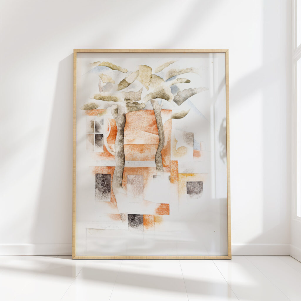 “Bermuda, Houses Seen Through Trees” by Charles Demuth captures the essence of Bermuda in an abstract form. The art consists of geometric shapes in soft oranges and grays, overlaid by the organic silhouettes of trees. This arrangement creates an impression of residential structures partially obscured by the natural environment, combining elements of nature and human habitation. The use of color and form evokes the tranquility and beauty inherent in the island’s architecture and scenery.