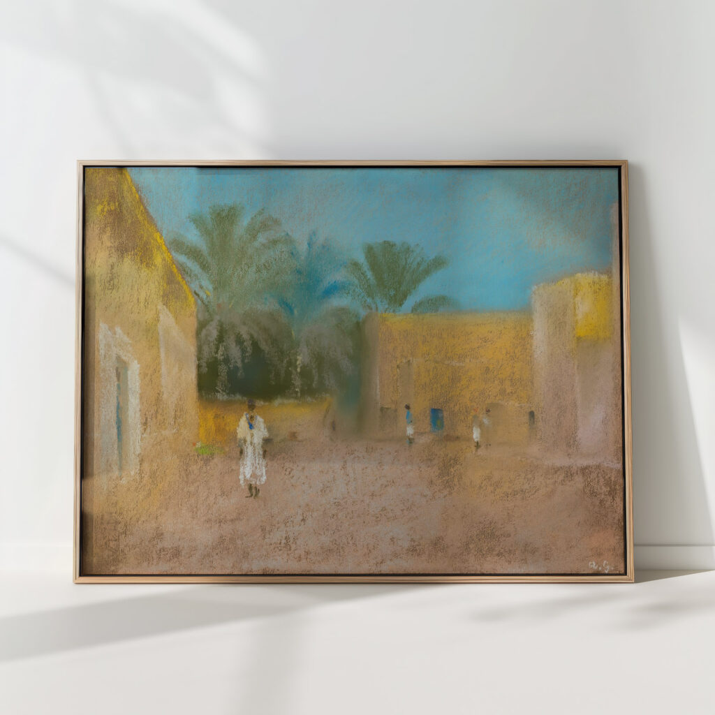 The print “Biskra I” by Augusto Giacometti captures the essence of a tranquil desert village. The warm palette produces a hazy, sun-drenched atmosphere, encapsulating the stillness of the arid environment. Palm trees rise above the low buildings, contributing to the composition’s sense of verticality and respite. Subtle figures punctuate the scene, suggesting daily life amidst the serene backdrop of the settlement. The soft rendering of light and shadow plays across the structures and ground, merging the natural and the man-made.