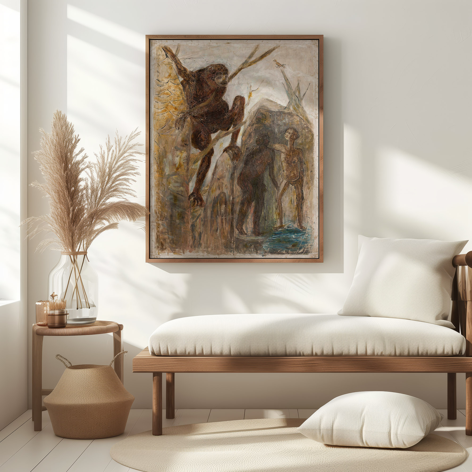 Tadeusz Makowski’s “Landscape with a Monkey” captures a mysterious, otherworldly scene. Centered is a monkey reaching out, its form captured in a lively, expressionistic style. In the background, enigmatic humanoid figures and a barren environment contribute to a surreal narrative. The muted palette suggests an ancient or dream-like quality, inviting viewers into a primordial and imaginative tableau.