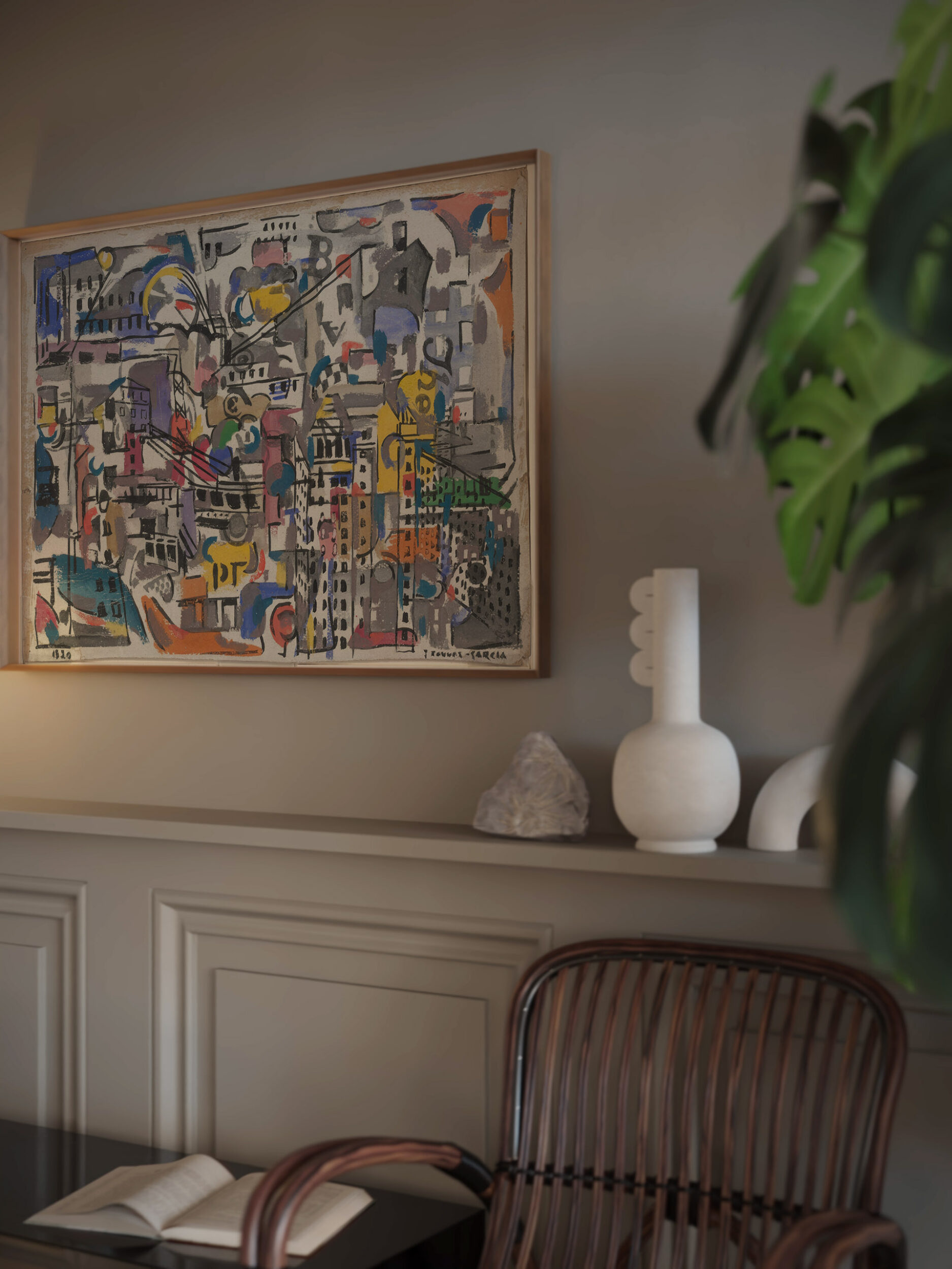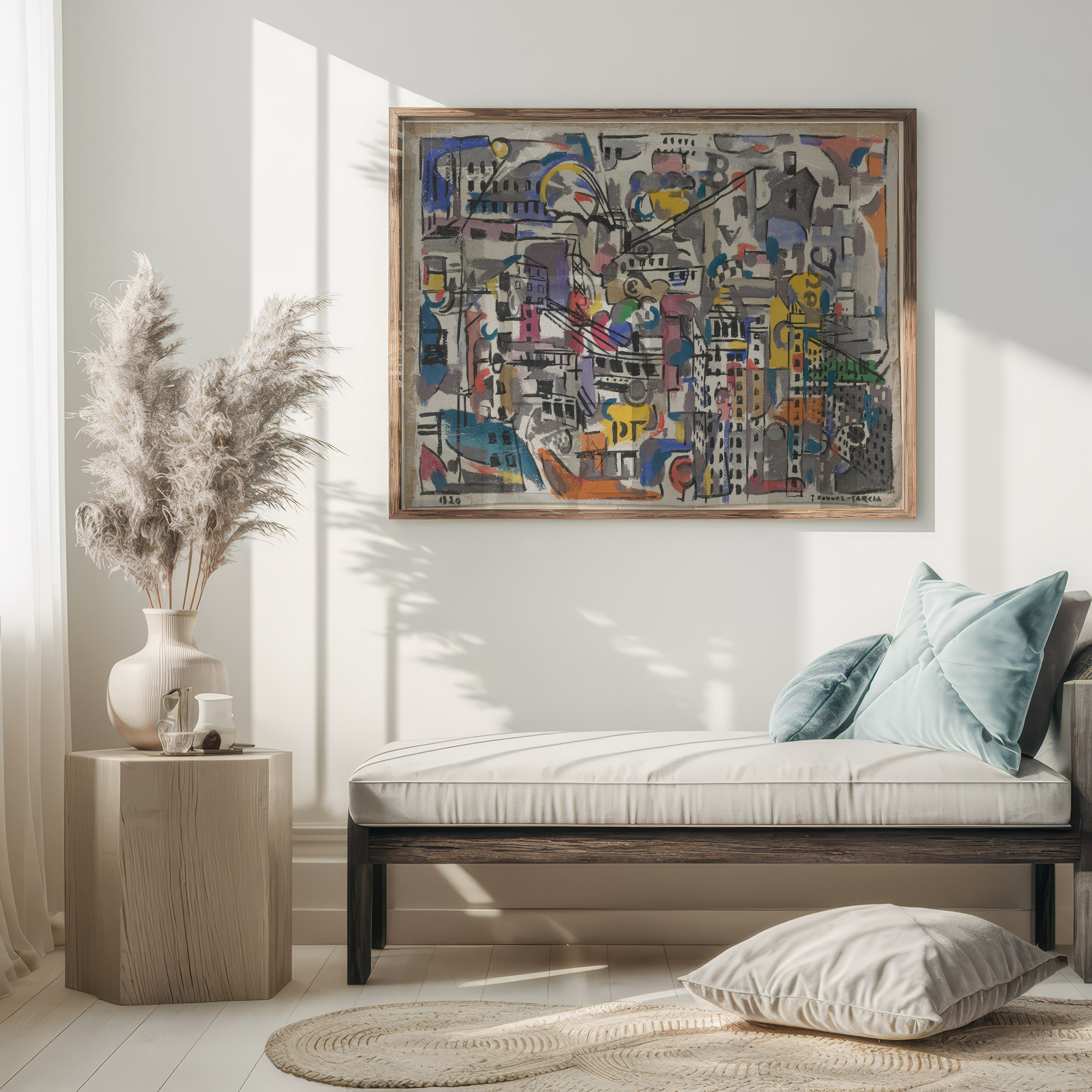 In Joaquín Torres-García’s print “New York City; Bird’s Eye View (1920),” a dynamic composition captures the essence of a vibrant metropolis. Abstract forms and various tones depict a cityscape from an aerial perspective, conveying the complexity and energy of urban life. Intersecting lines and scattered color blocks create a sense of movement and depth. The artwork evokes the rhythm and structure of New York City through a unique visual language that combines representational elements with geometric abstraction.