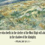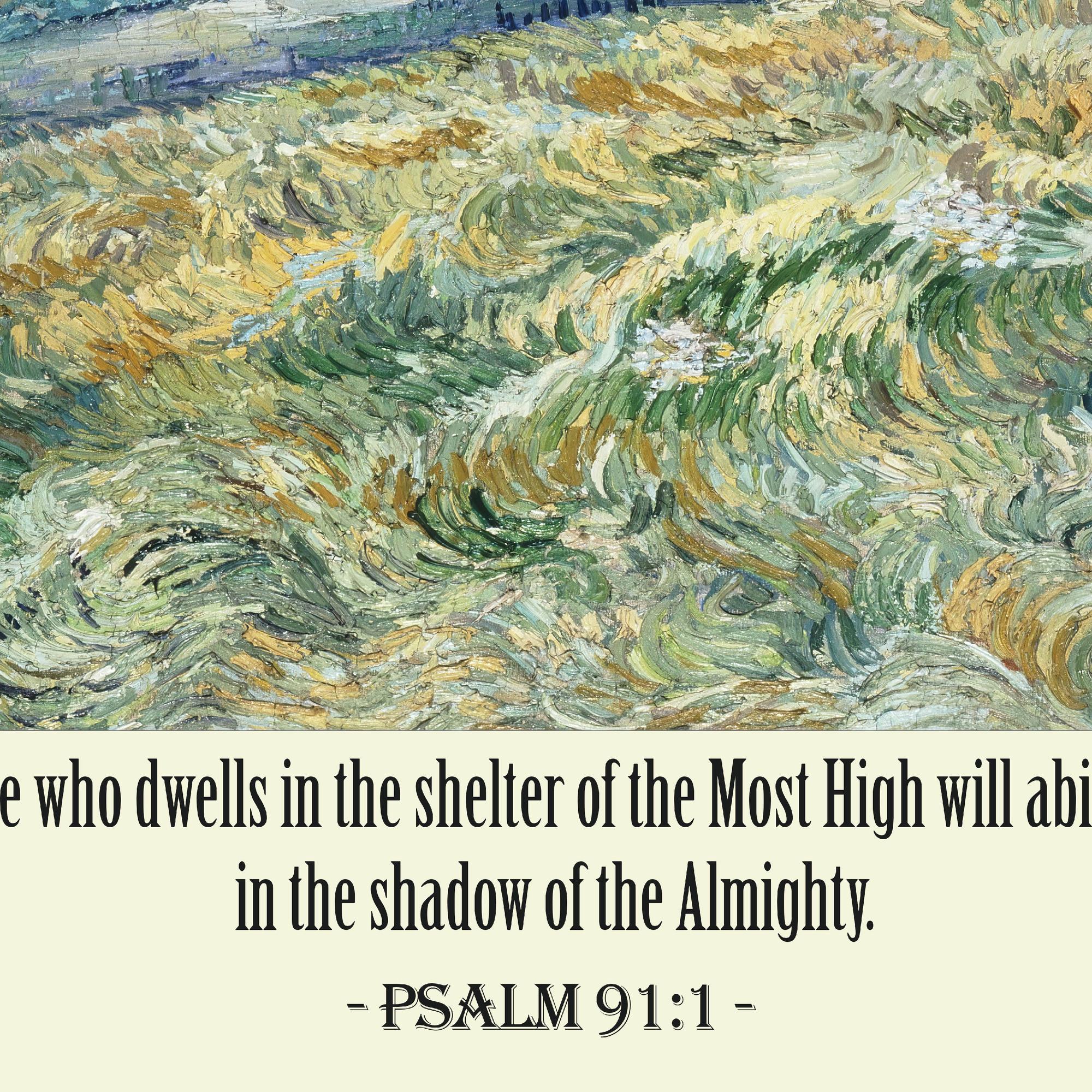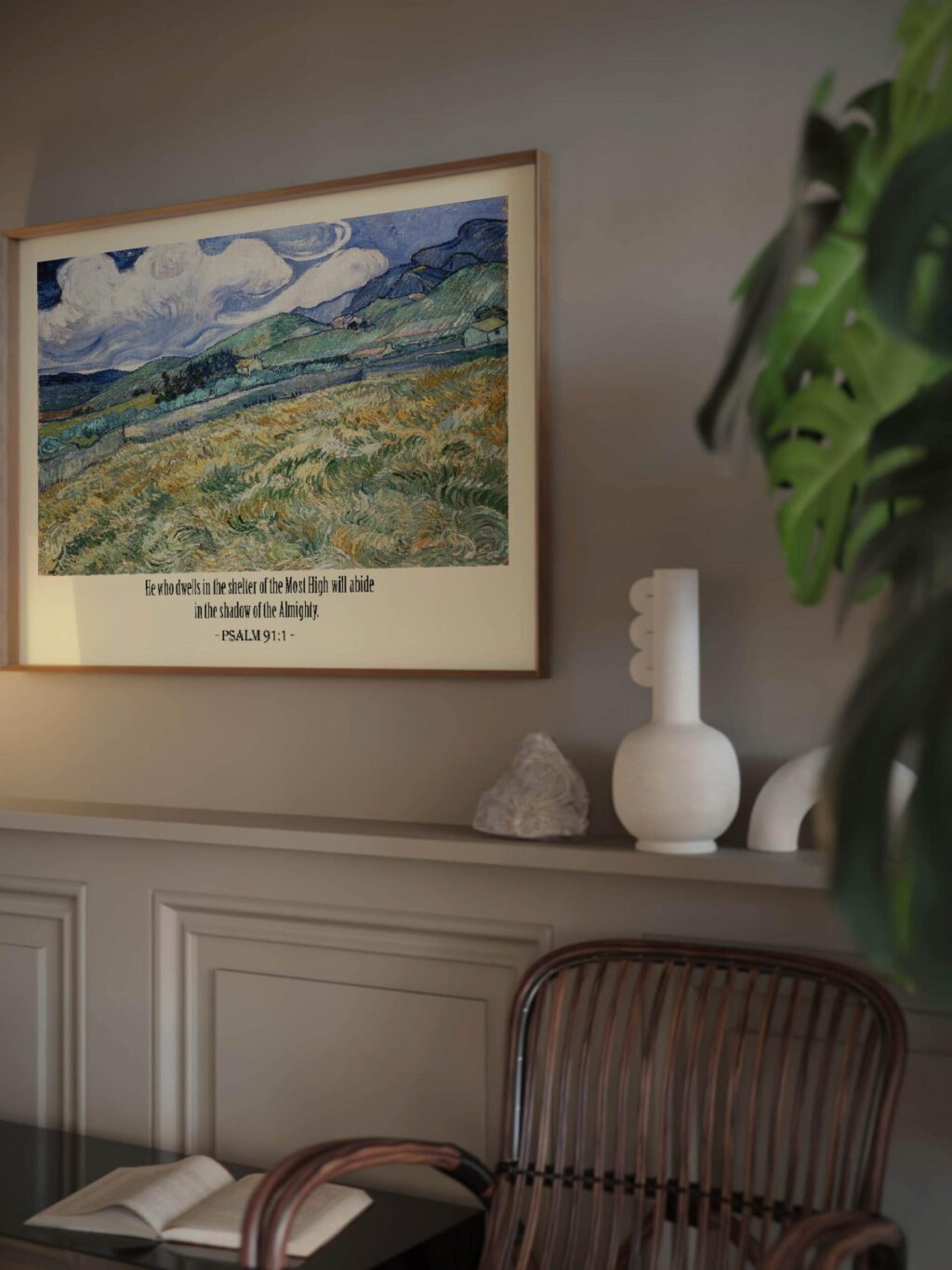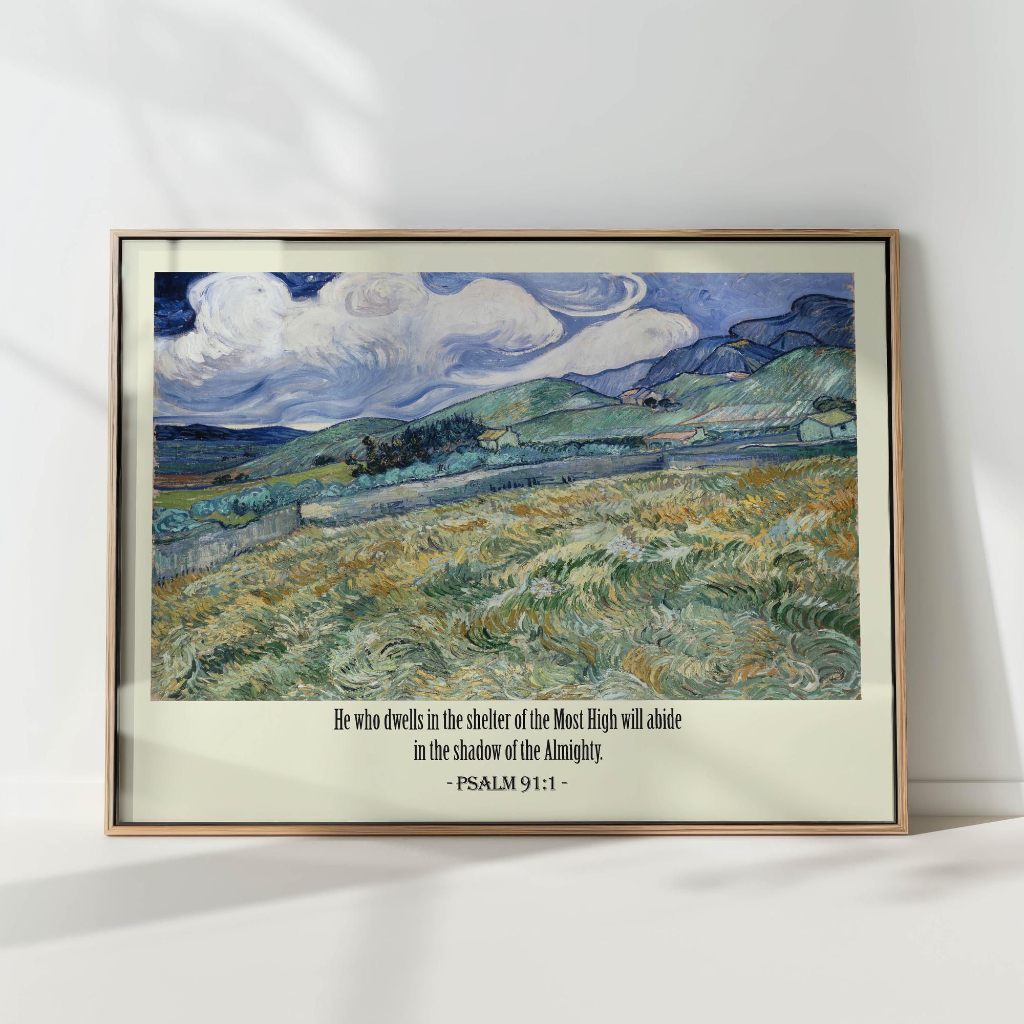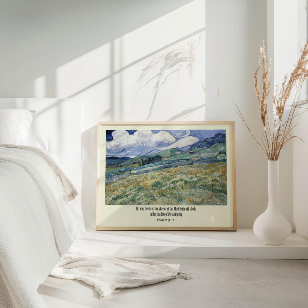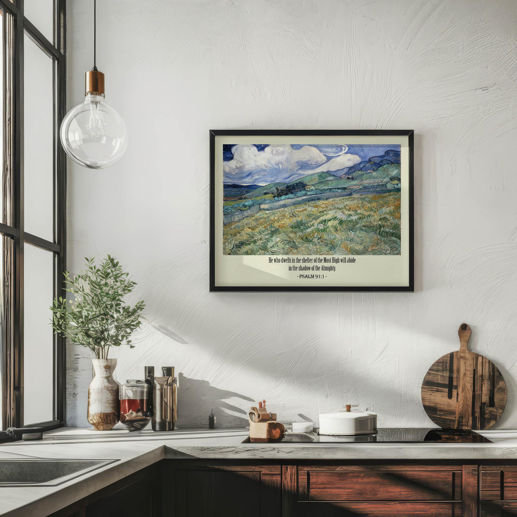 This high quality print displays a serene and vibrant landscape, filled with an expansive sky of swirling clouds and a vibrant field. A green mountainous backdrop complements the dynamic scenery, while a thoughtful excerpt from Psalm 91:1 adds a spiritual dimension. This print merges the tranquil beauty of nature with the profound wisdom of biblical text, making it a meaningful addition to any space searching for a touch of peaceful contemplation and spiritual inspiration.