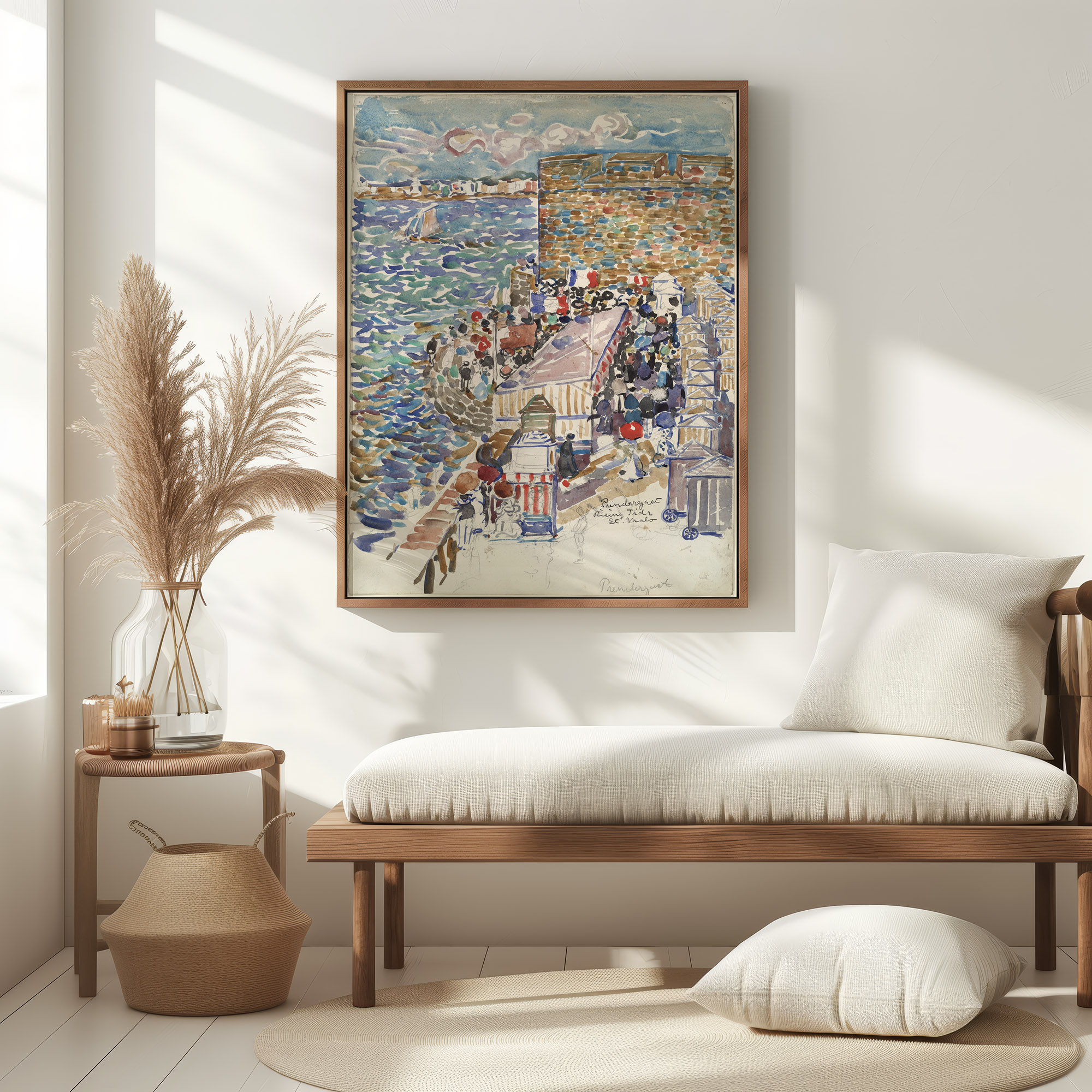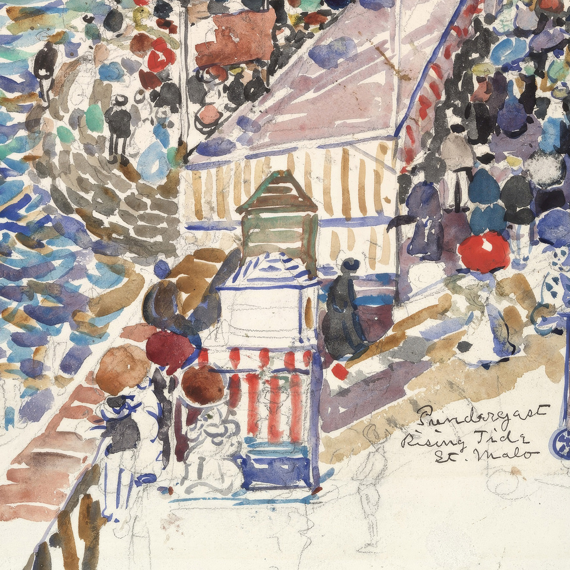 Maurice Prendergast’s “Rising Tide, St. Malo” captures a bustling coastal scene filled with figures mingling and engaging in leisure activities by the sea. The composition creates a sense of movement and rhythm through its use of flowing lines and contrasting patterns. With an expressive watercolor technique, the artist brings to life the reflective qualities of water and the vibrancy of the crowd, radiating the energy of a seaside community in harmony with the marine environment.
