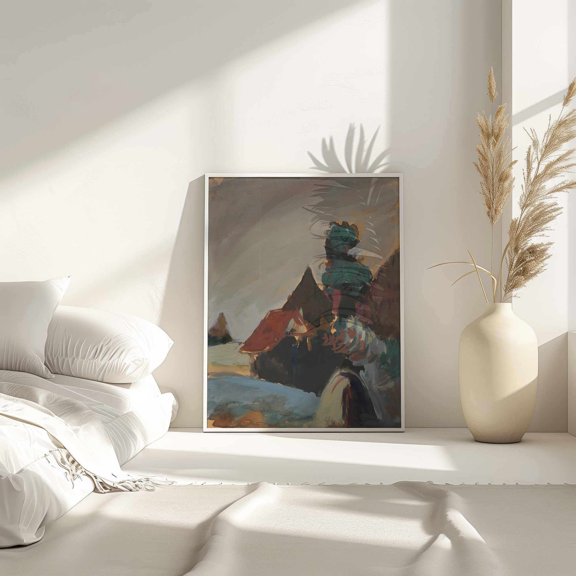 “Dedinské chalupy” by Ján Novák is a serene depiction of village life, focusing on the harmonious integration of architecture and landscape. The artwork highlights rural cottages nestled in a tranquil environment, evoking a sense of peace and simplicity. The composition leverages natural light and shadows to accentuate the forms and textures within the scene, creating a connection between the viewer and the depicted way of life.