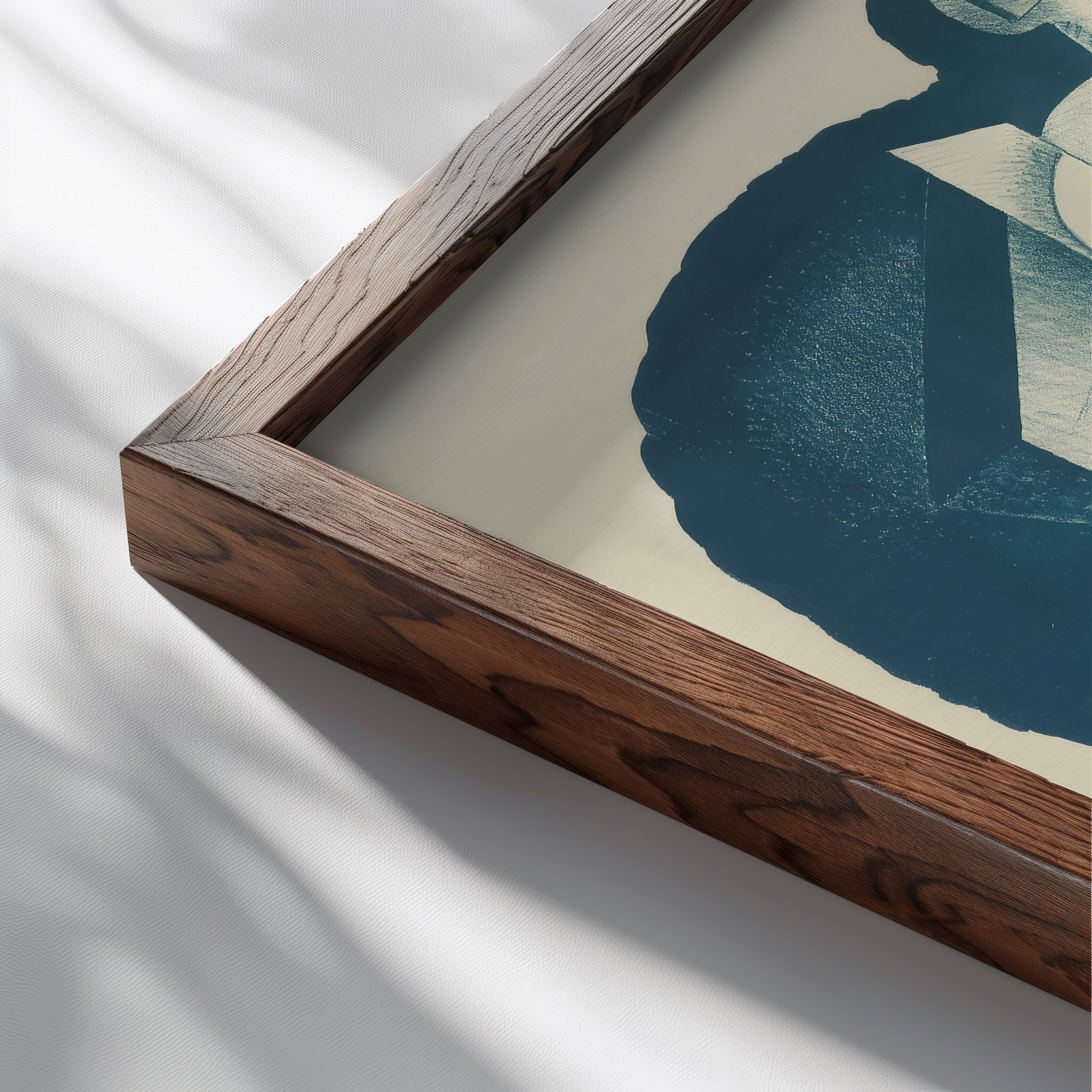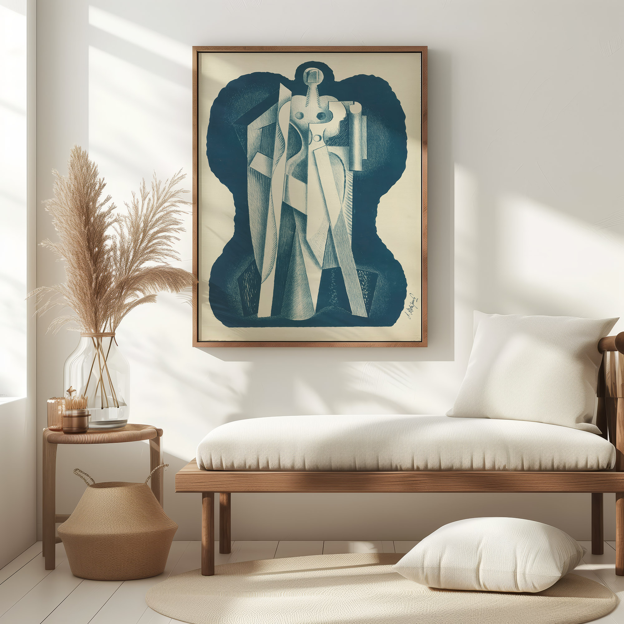 The print presents a complex interplay of geometric forms and lines, creating a fragmented yet harmonious composition. Monochromatic shades are strategically used to add depth and contrast, giving the illusion of three-dimensional space. The abstract arrangement suggests a nod to Auguste Rodin’s sculptural elements, demonstrating a balance between fluidity and rigidity. The print challenges the viewer to perceive beyond the visible, engaging with the transformative potential of shapes and the play of light and shadow.