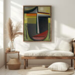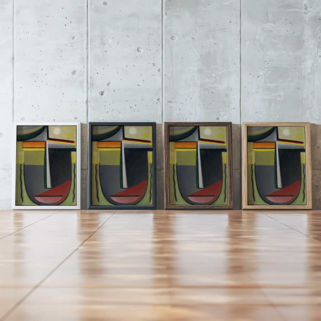 “Abstract Head, Inner Vision Green-Gold” by Alexej von Jawlensky is a study in abstract expression through shape and color. The print contrasts harmonious greens and luxurious golds against accents of deep black and warm reds. Simplified facial elements suggest a human likeness within the geometric abstraction, while distinct lines and forms create a sense of structured harmony. The use of color and composition results in a work that is evocative and richly textured, engaging the viewer in a contemplation of the abstracted visage.