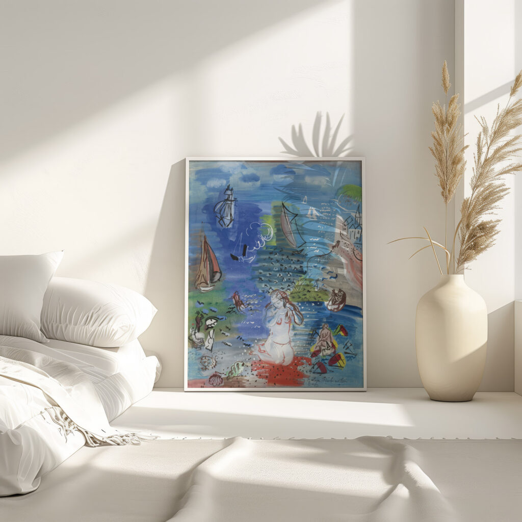 Raoul Dufy’s creation “Amphitrite” showcases a dynamic maritime setting teeming with activity. Central to the work is a figure that may depict the mythical sea goddess, surrounded by the bustling energy of seafarers and beach visitors. Ships and boats of various sizes sail the blue waves under a bright sky, while the shore is animated with colorful umbrellas and individuals relishing the coastal atmosphere. The print encapsulates the essence of seaside leisure and mythological reference, offering a window into a vivid, euphoric coastal realm.