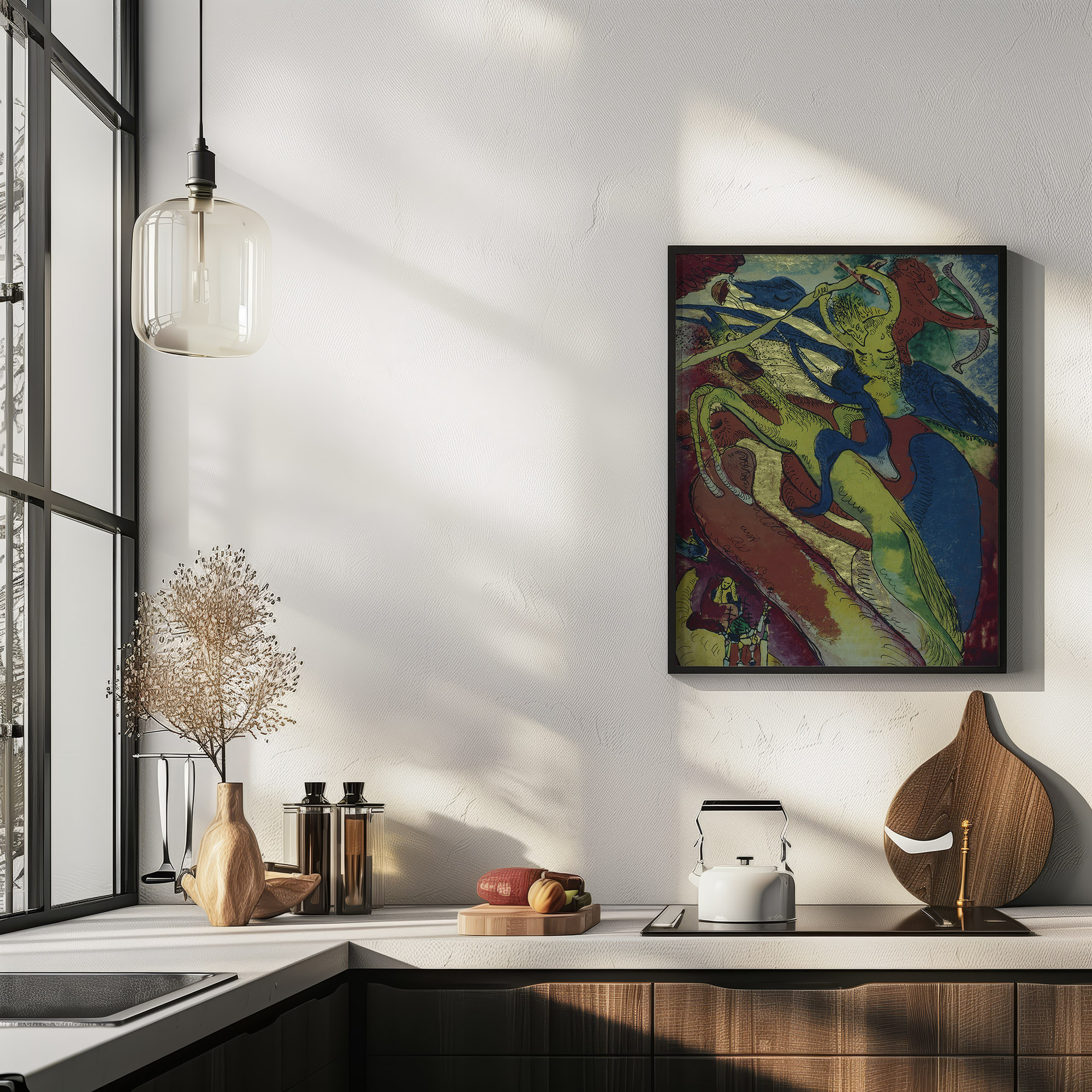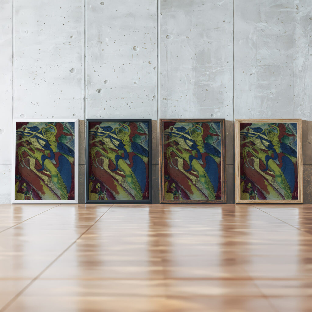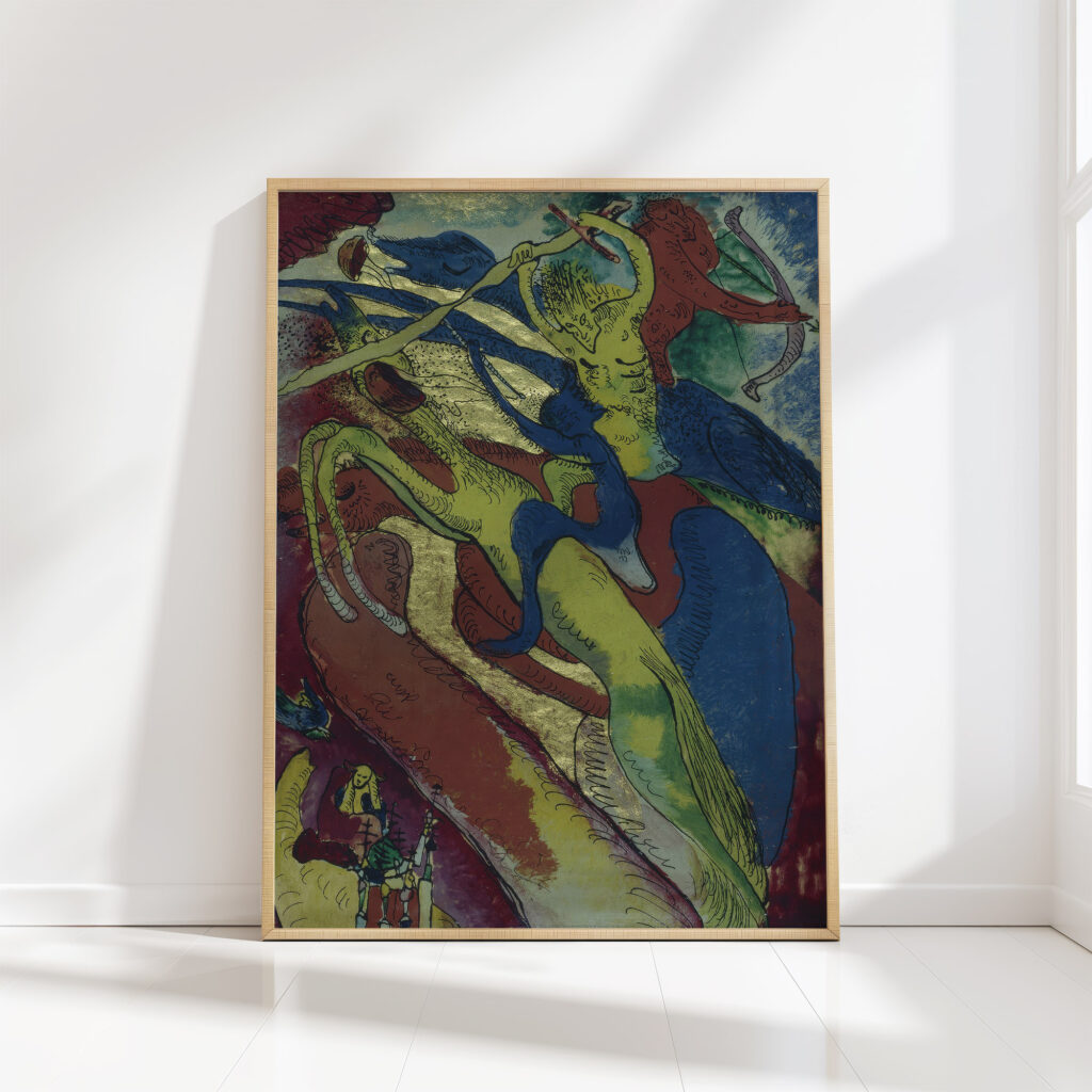 The print “Apocalyptic Riders I” by Wassily Kandinsky is a striking visual composition with vivid colors and abstract shapes. The dynamic figures appear in motion, wielding what seem to be weapons, suggesting a scene of chaos or conflict. The use of intense hues and fluid lines contributes to a feeling of foreboding and drama, drawing the viewer into a tumultuous, possibly otherworldly tableau.
