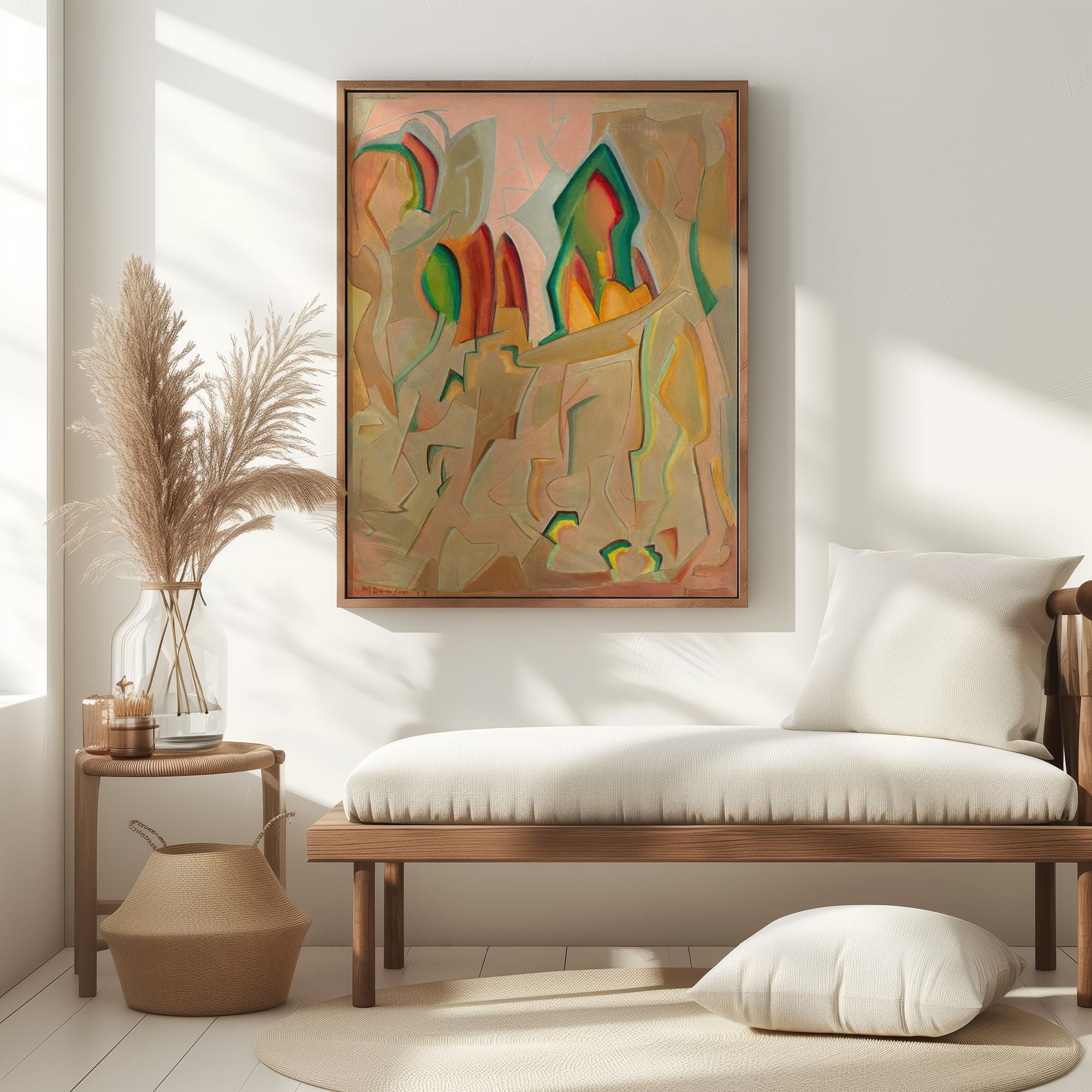 Manierre Dawson’s “Ariel” is characterized by its abstract nature, deploying geometric and organically shaped forms that play with perception. Warm and cool hues contrast and interact, creating a lively composition. The work invites viewers into an interpretive dialogue, as its elements hint at figuration within a predominantly abstract design language, leading to various interpretations of its content and meaning.