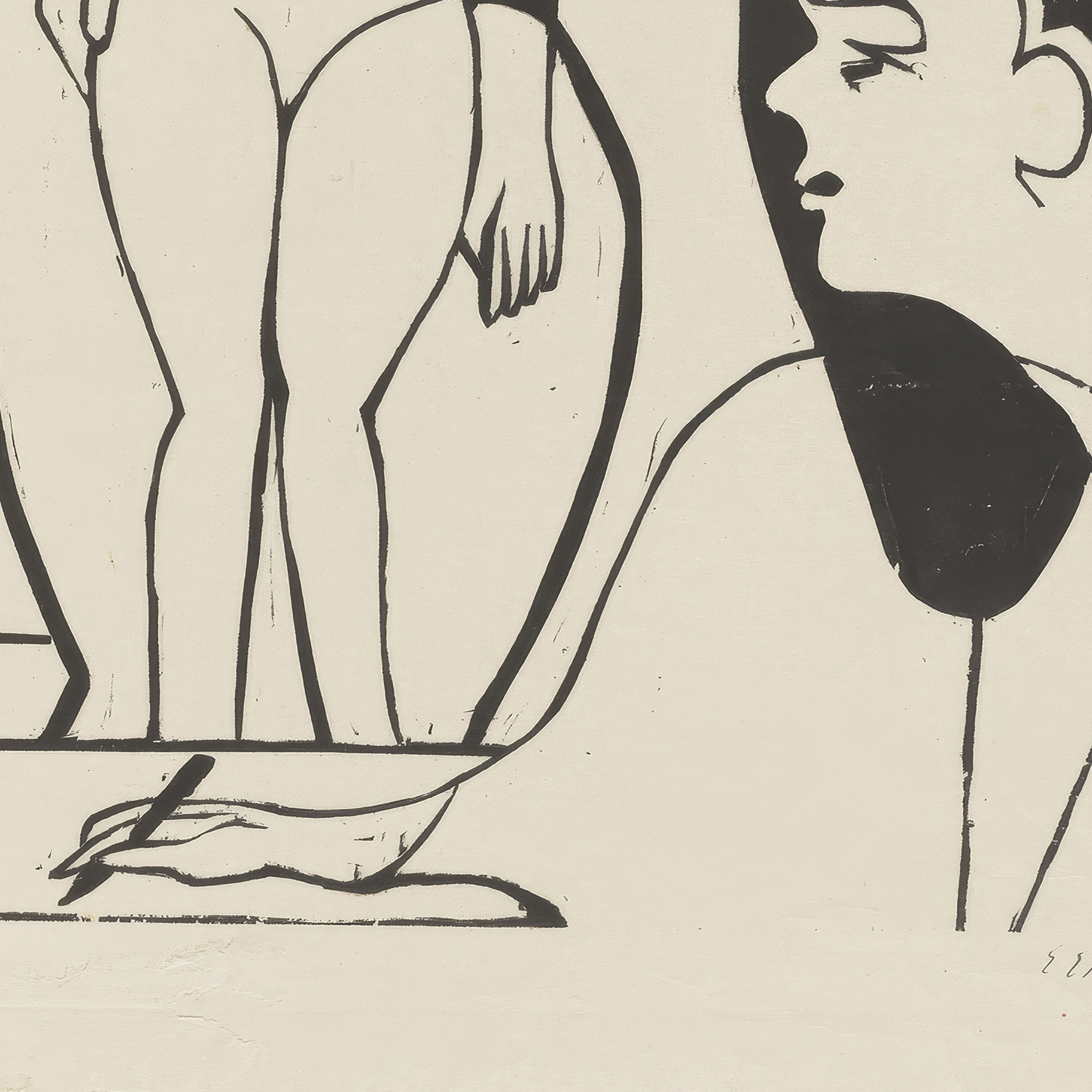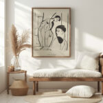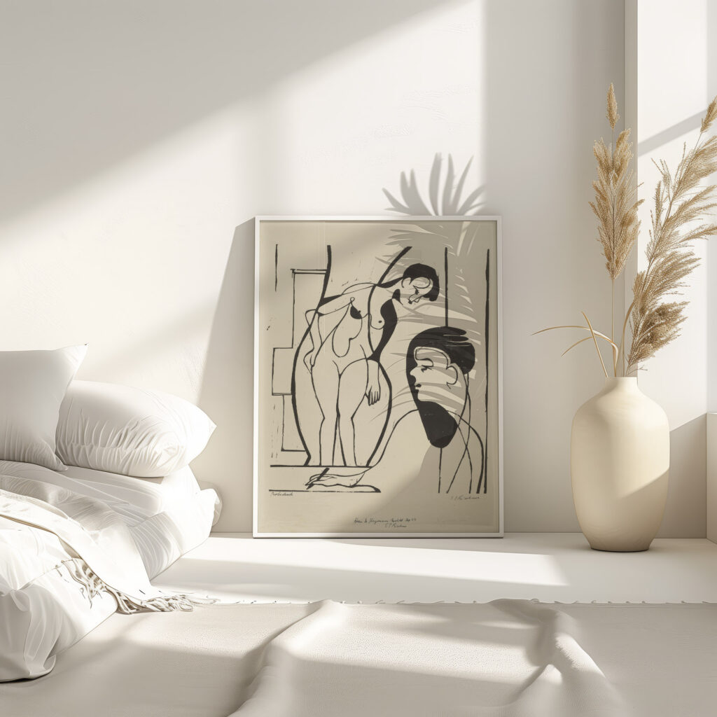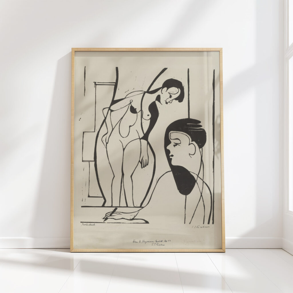 “Künstler und Modell” by Ernst Ludwig Kirchner displays an expressionist style with stark contrasts, embodying the dynamic between the creator and muse. The artwork captures a moment where the artist intently observes the model, whose form is abstracted into fluid lines. This interaction highlights the artistic process, emphasizing the themes of observation, interpretation, and the depiction of human form. The print’s stark duality and expressive contours convey movement and psychological depth, inviting viewers to contemplate the artist’s perspective.