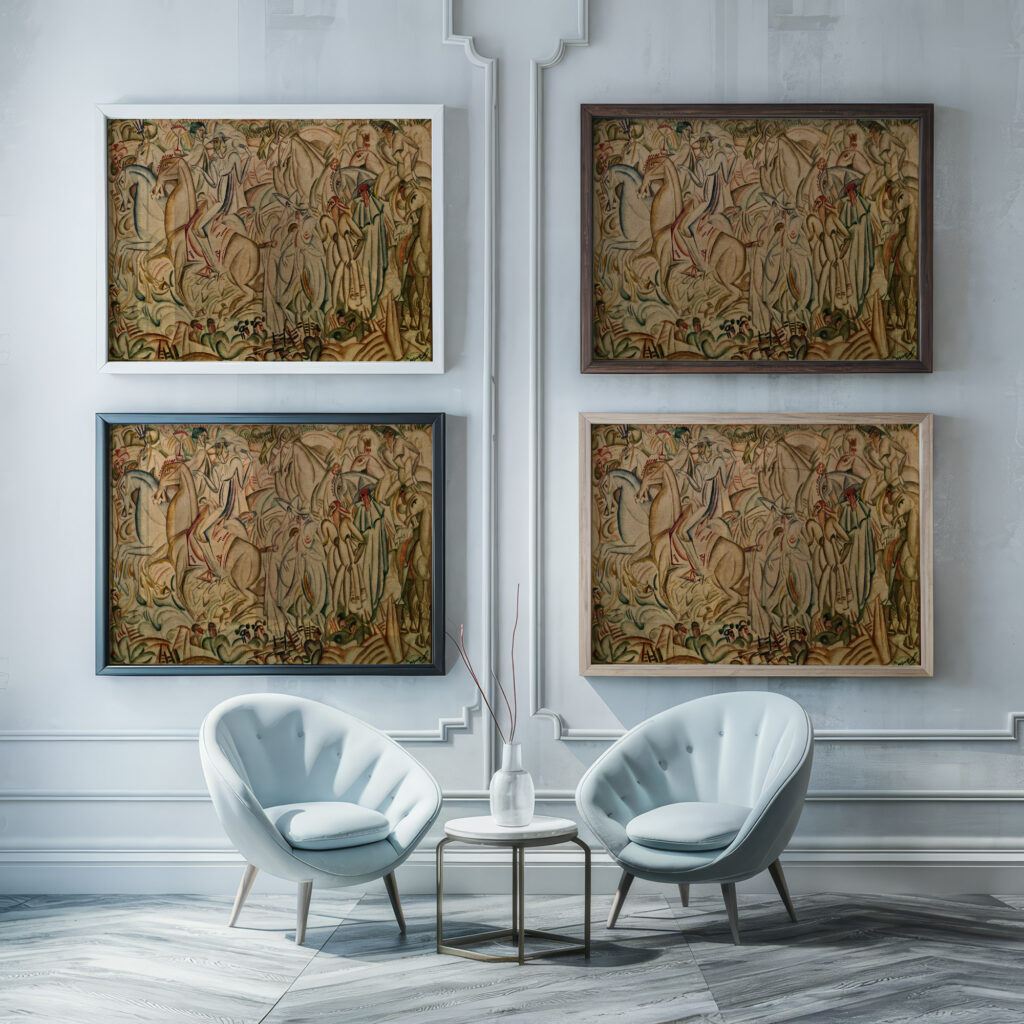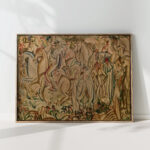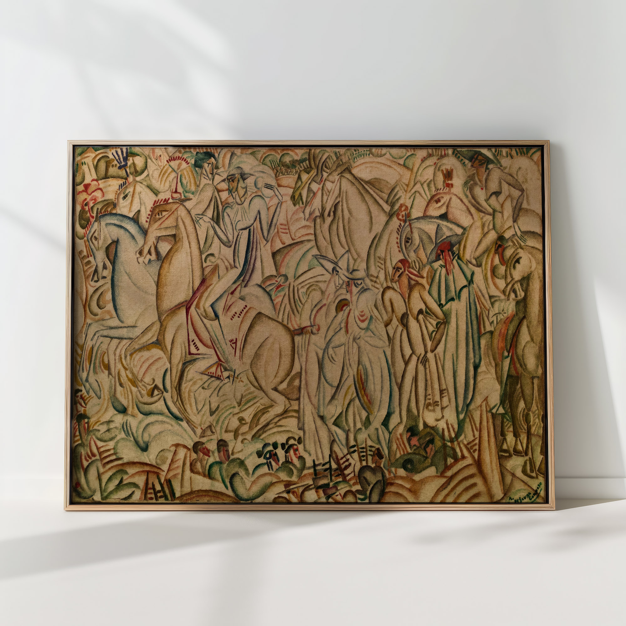 “Before the Bullfight” by Amadeo de Souza-Cardoso captures the essence of anticipation and fervor. The print presents abstract humanoid and equine forms intertwining, conjuring the chaotic energy of a bullfight. Muted tones run through the complex arrangement of shapes, while strokes and patterns hint at the cultural significance of the event. The composition is a sweeping, whirlwind-like orchestration of figures that evokes the sensory overload preceding the bullfight spectacle.