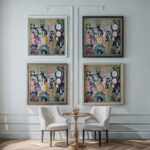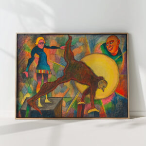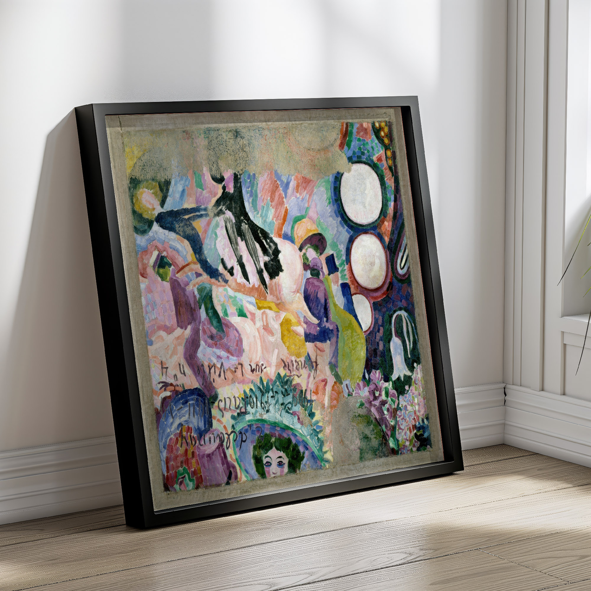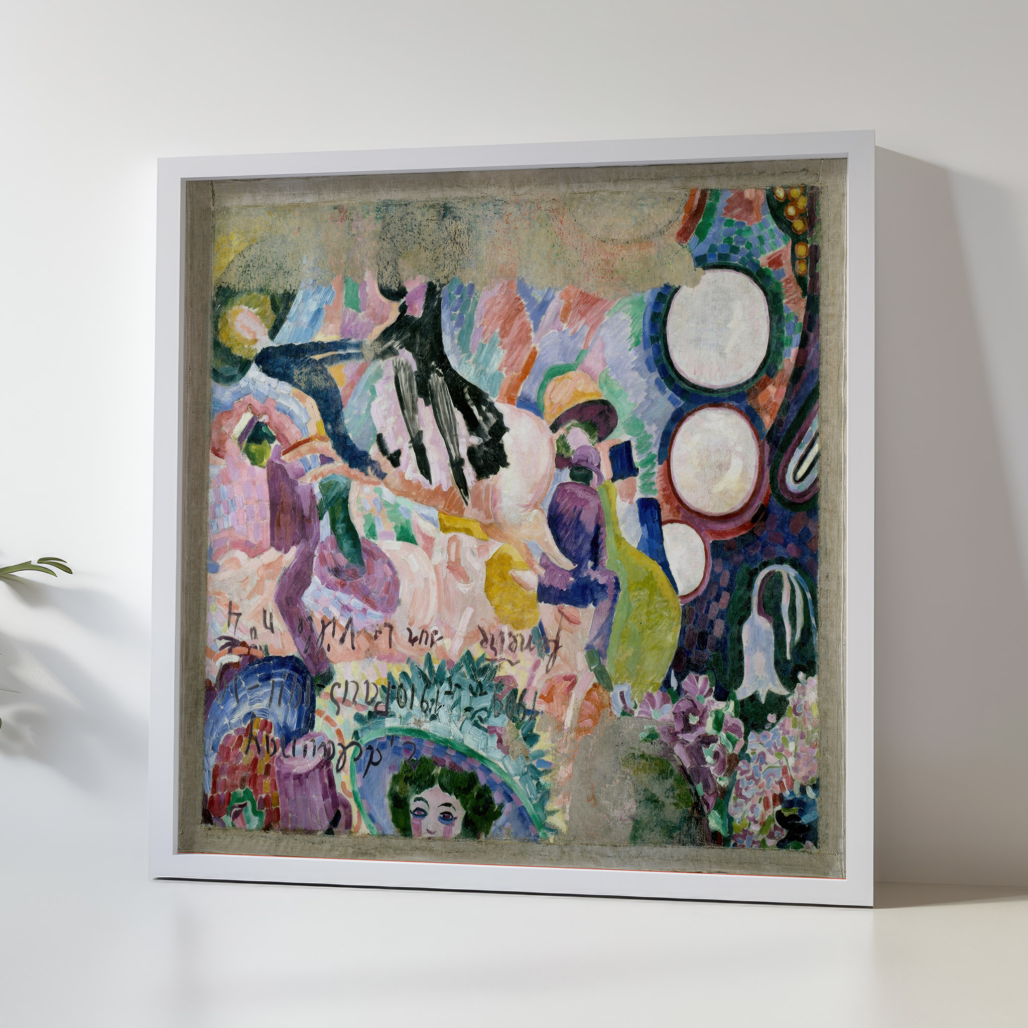“Carousel of Pigs” by Robert Delaunay is an energetic and vivid representation that blends abstraction with figurative elements, presenting swirling forms and splashes of color that create a sense of circular motion suggestive of the carousel concept. The print alludes to a playful theme with pig silhouettes, yet retains an air of sophistication through its complex design and bold color palette.