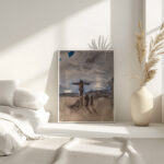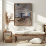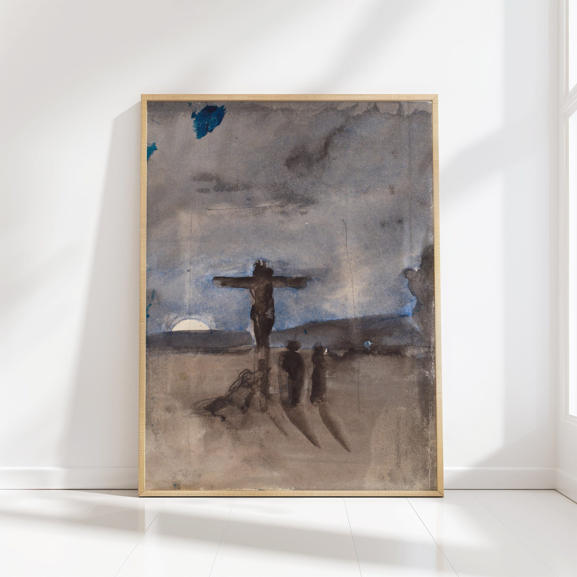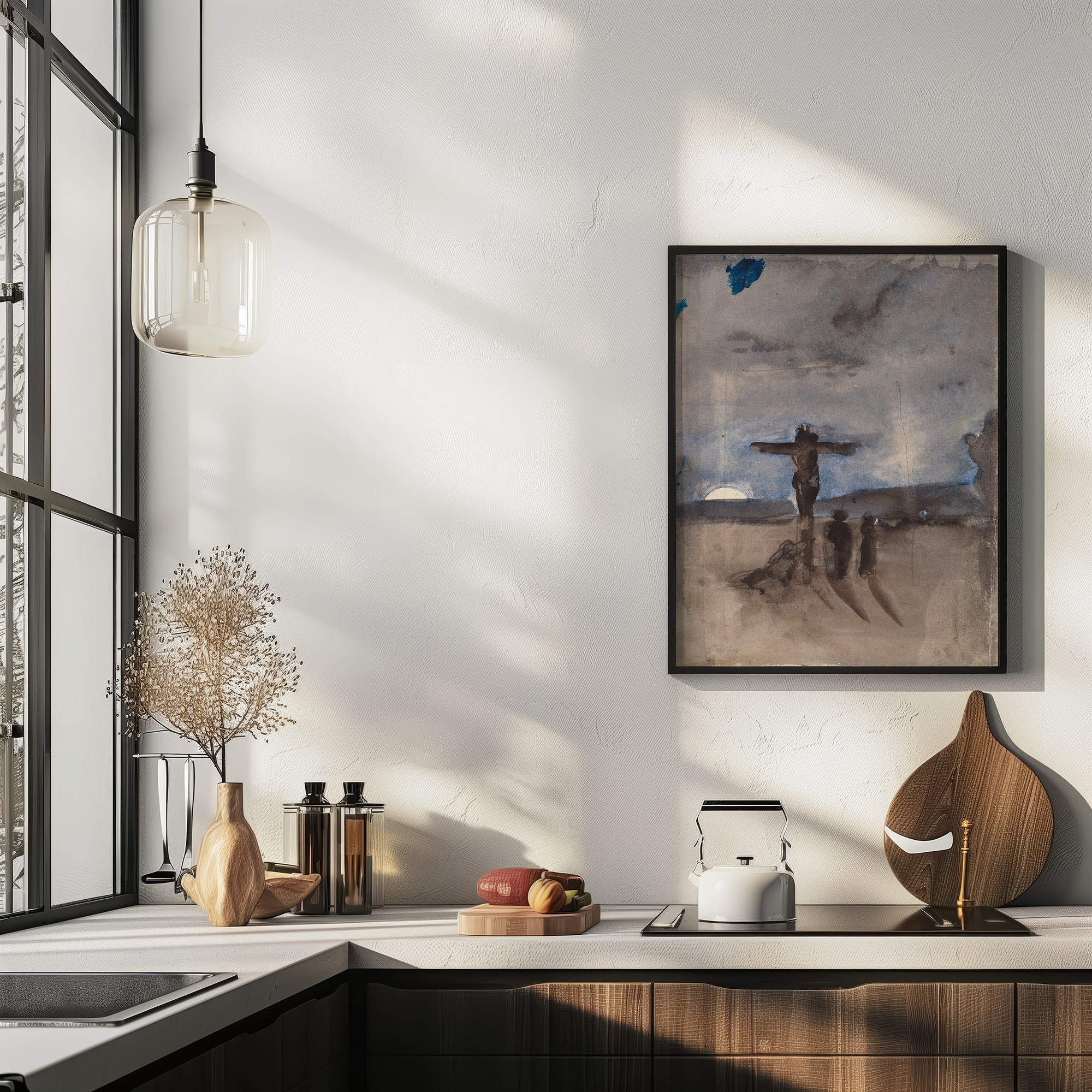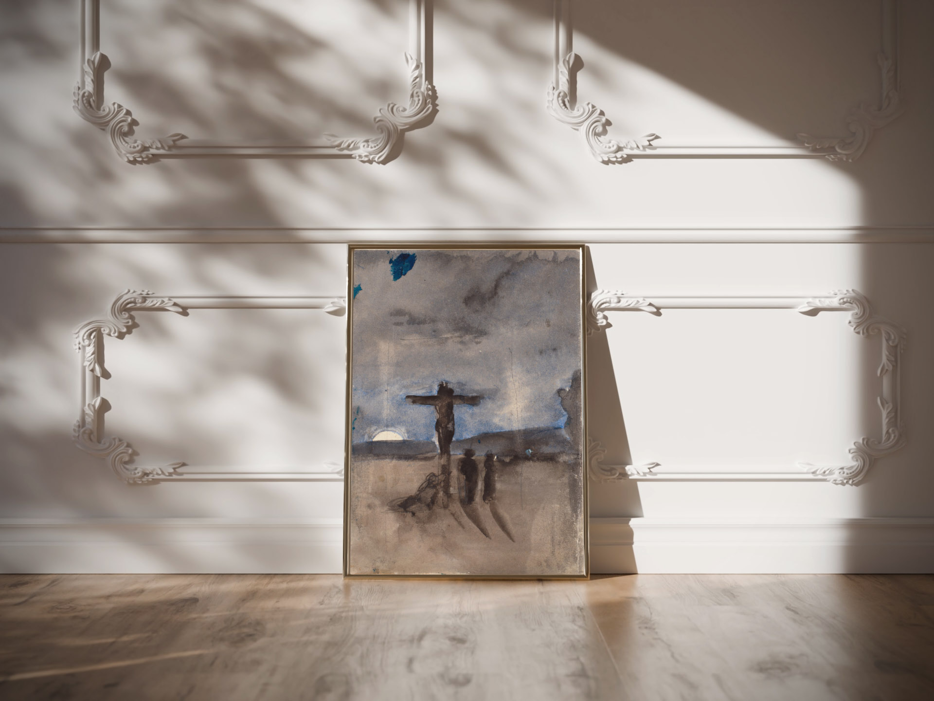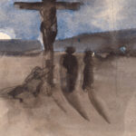“Kristus på korset” portrays a powerful depiction of the crucifixion, with a stark cross dominating the composition. The central figure of Jesus appears solemn and enduring. Shadowy onlookers stand beneath, enhancing the feeling of isolation. The minimalist landscape stretches beneath a brooding sky, suggesting an atmosphere of contemplation and reverence. The use of muted colors contributes to the artwork’s poignant emotional resonance.