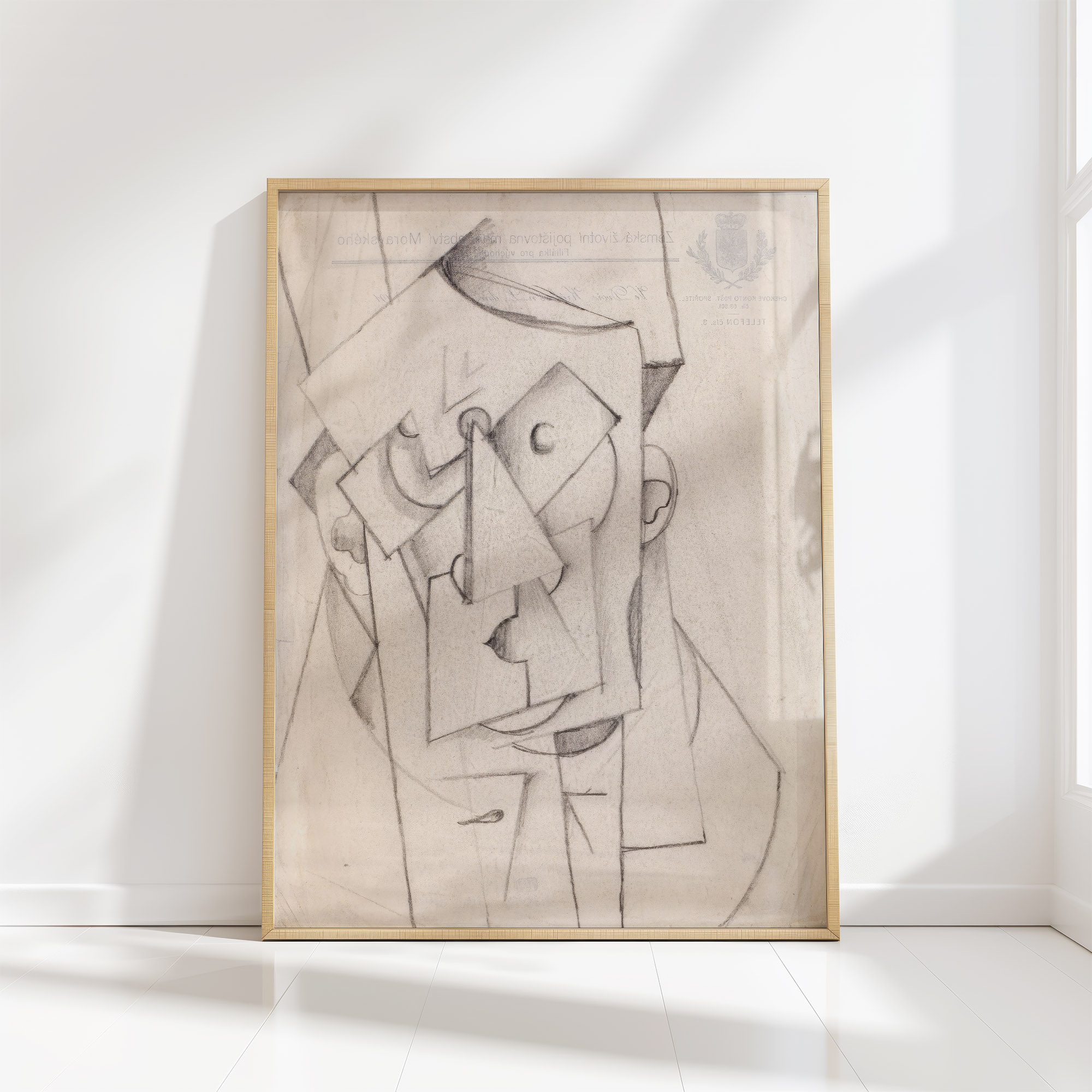 “Cubist Composition – The Head” by Oto Gutfreund is an abstract print featuring fragmented and angular shapes that represent a human head with distinct cubist style.