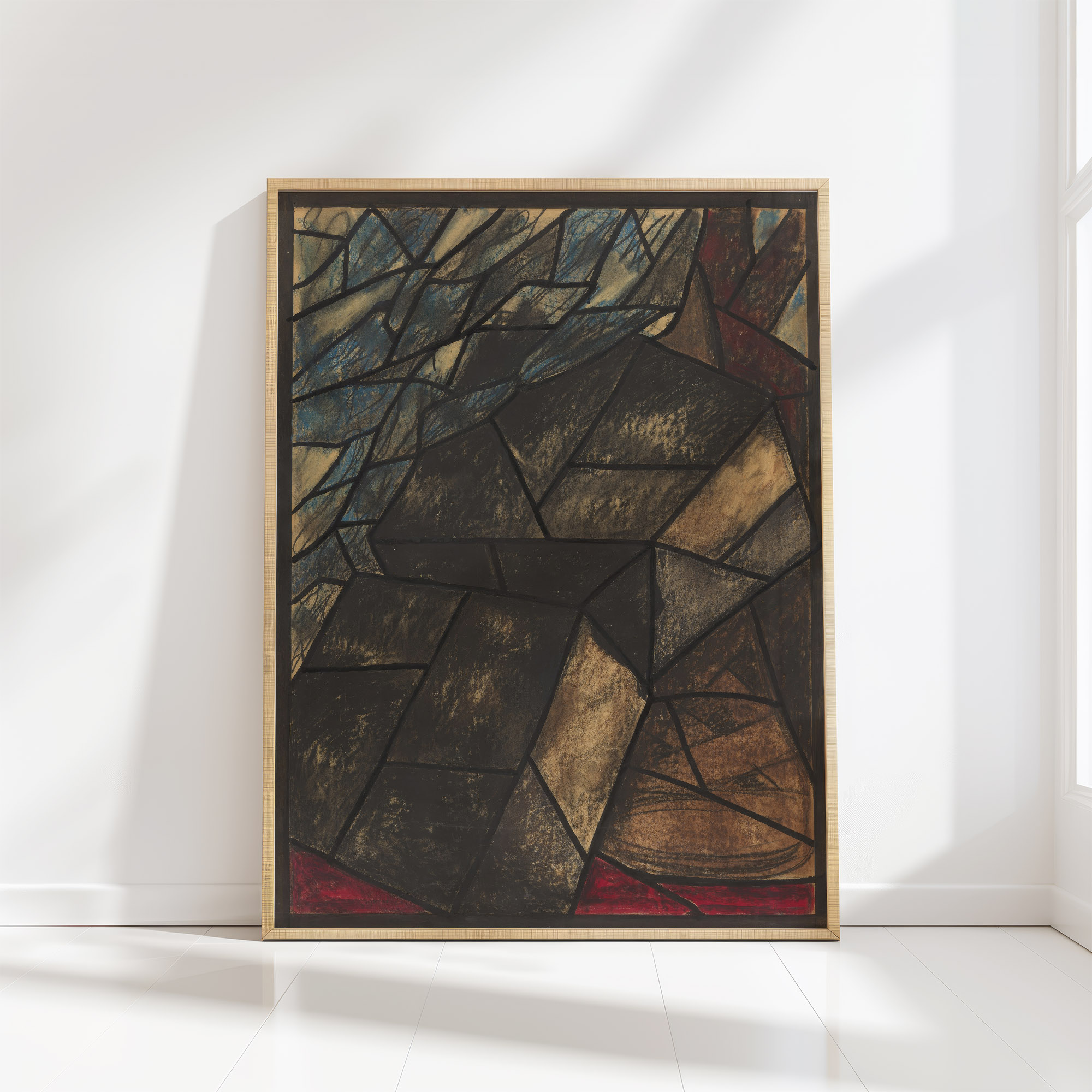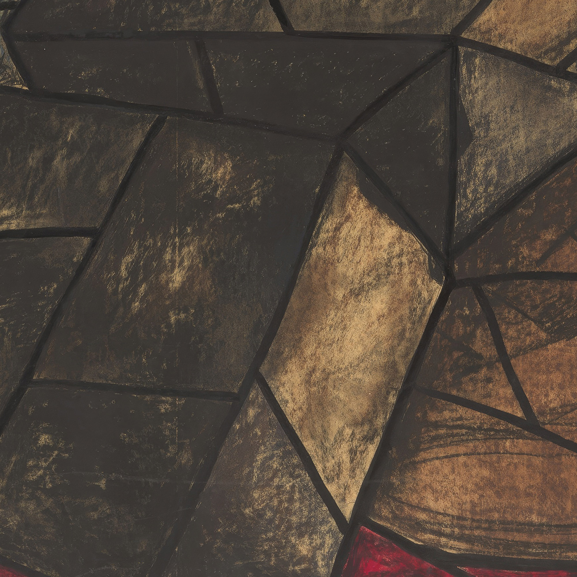 The print by Richard Nicolaüs Roland Holst is an abstract composition reminiscent of a stained glass window, with an array of geometric shapes. Dark and earthy tones prevail across the design, creating a sense of depth and contrast. Subtle infusions of brighter colors such as blue and red add accents and suggest light filtering through the shapes, echoing the spiritual and architectural qualities consistent with its intended setting in Dom te Utrecht’s northern transept. The print conveys both the solemnity and the intricate design characteristic of religious art and architectural features.