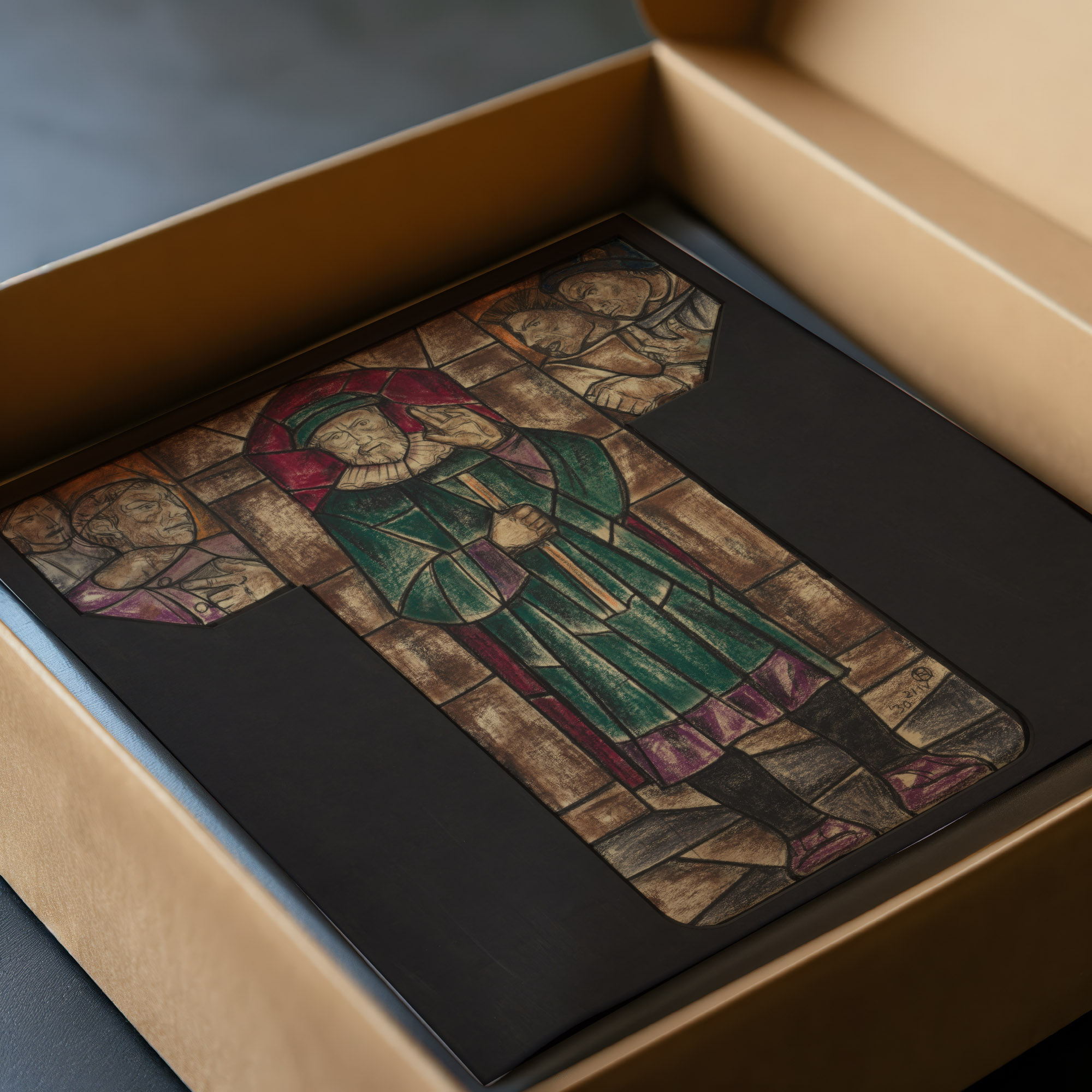 This intricately designed print showcases a central character wearing a traditional robe and a head covering, poised as if in contemplation or mid-discourse. He holds a staff, and his expression is thoughtful. In the background, architectural elements suggest an interior space, possibly of significance. Flanking this main figure are smaller, attentive figures, each seemingly engaged in the scenario, contributing to the narrative quality of the piece. The use of rich, dark tones imbues the scene with solemnity and gravitas.