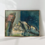 “Dream” by Ján Novák is a captivating piece characterized by fluid, abstract shapes and a harmonious interplay of colors. The artwork invokes a sense of movement with its sweeping brushstrokes and a contrast of dark and light elements, suggesting depth and emotion. The use of indefinite forms allows for individual interpretation, evoking imagination and personal musings in the mind of the viewer.