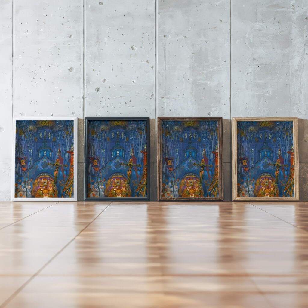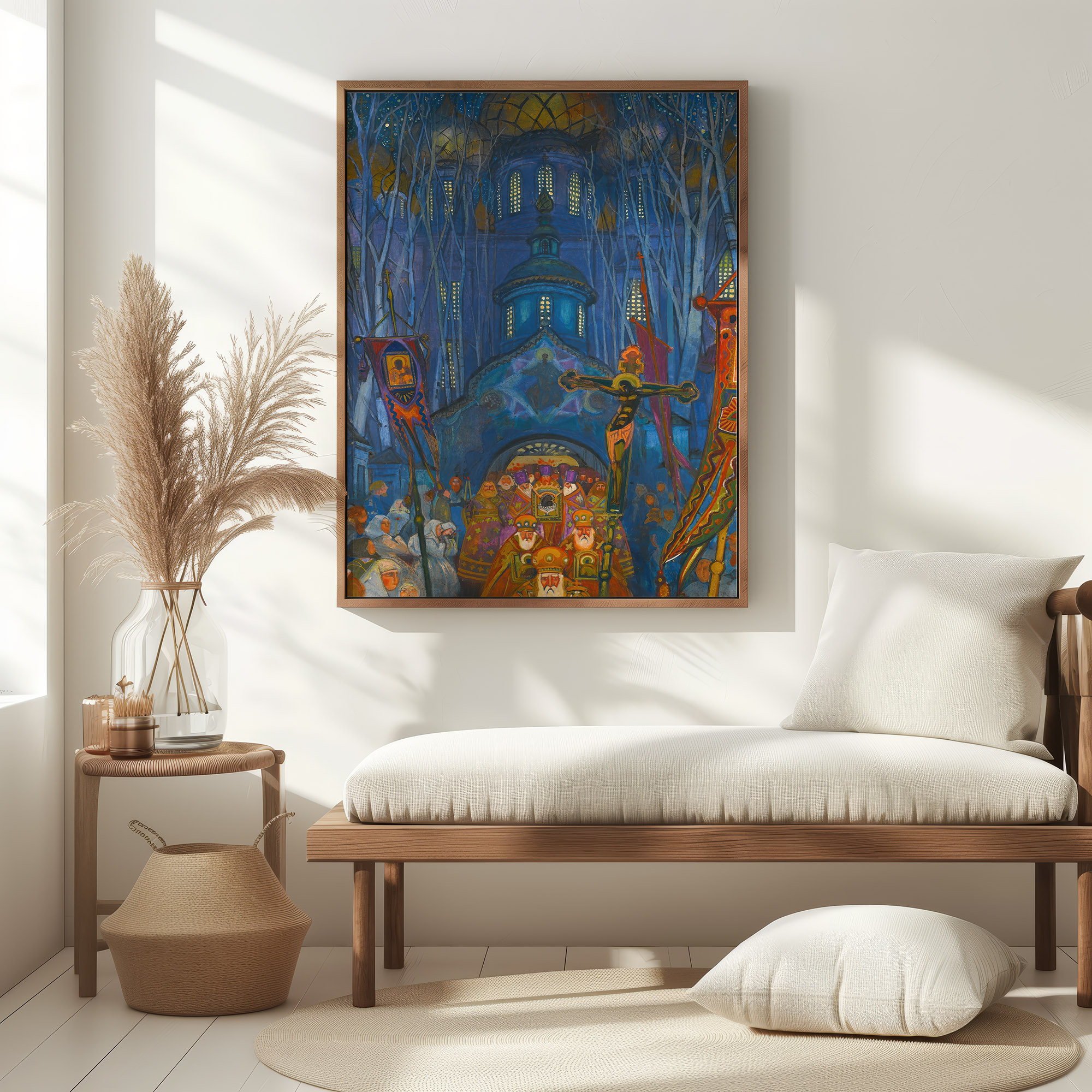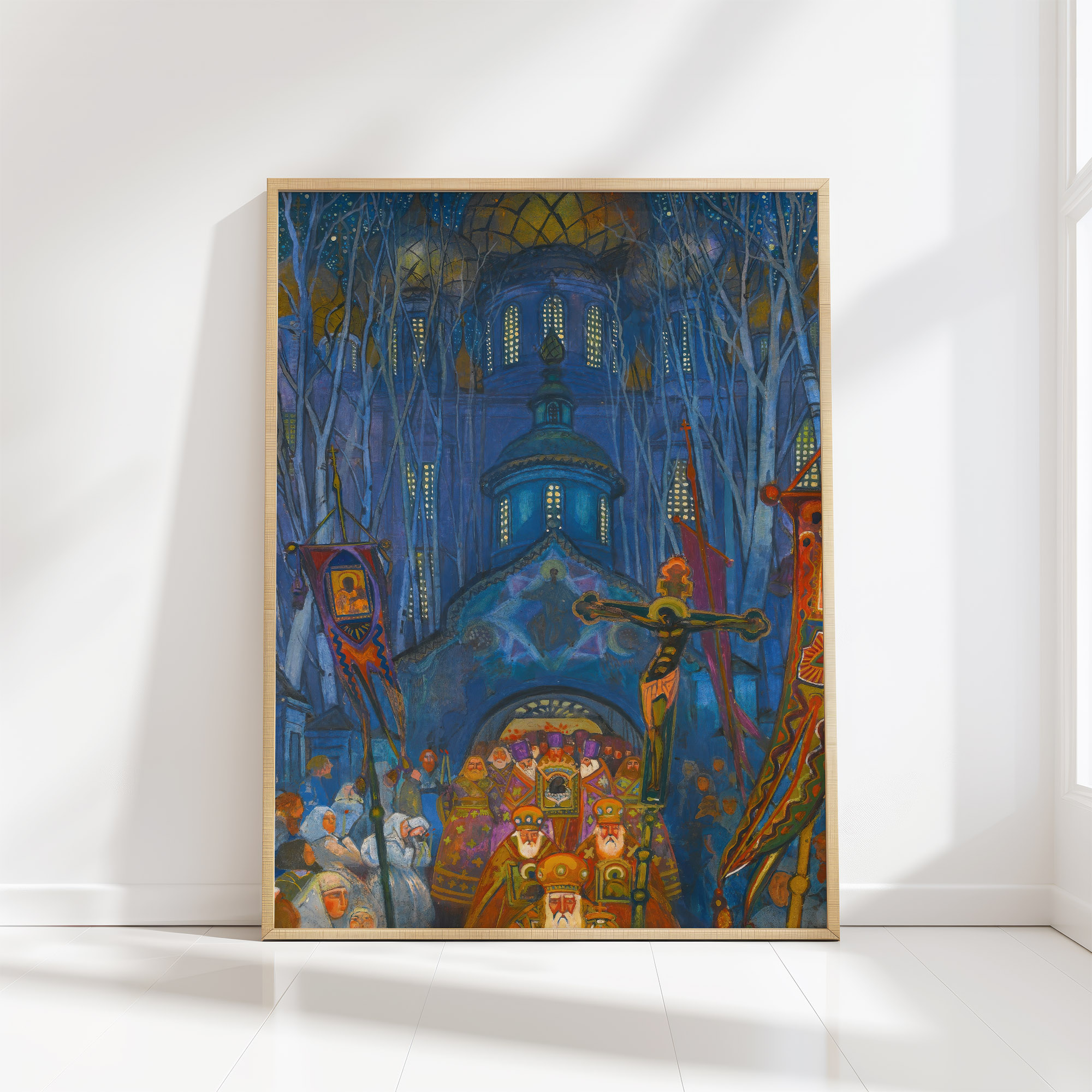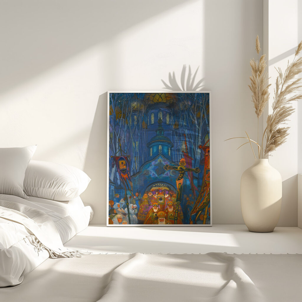 The work, “Easter Night” by Leonid Mikhailovich Brailovsky, features a vivid and atmospheric portrayal of a religious gathering. A crowd of people is assembled inside a church, their faces illuminated by soft light, suggesting reverence and celebration. The focal point is a procession within the church, highlighted by religious iconography and ornate, colorful banners. The architecture is imbued with a sense of grandeur, featuring domes and arches that reach towards a starry night sky. The entire scene is infused with a sense of spirituality and the cultural significance of the Easter celebration.