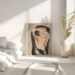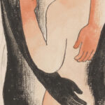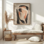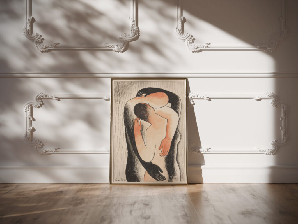 This print by Mikuláš Galanda, titled “Embrace,” captures an intimate moment between two individuals whose forms intertwine in a harmonious embrace. The artwork conveys a sense of closeness and affection through the fluid contours and the gentle overlap of their bodies. The figures are rendered with a simplicity that accentuates the essence of their connection, while the contrasting colors and abstract elements underscore the artistry of the composition. The overall effect is a poignant representation of human touch and the universal theme of love.