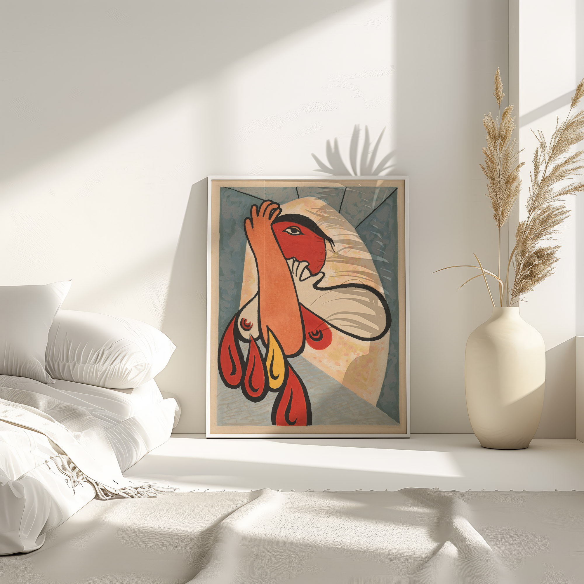 “Fire (1938) – Mikuláš Galanda” presents an abstract representation of a figure enveloped by flames. Bold reds and oranges evoke the heat and energy of fire, juxtaposed with the serene blues and grays in the background. The stylized human form merges with the fire’s dynamic shapes, creating a sense of movement and transformation. The print employs a minimalist aesthetic but conveys a powerful theme interpreted in the interplay between the human figure and the elemental force.